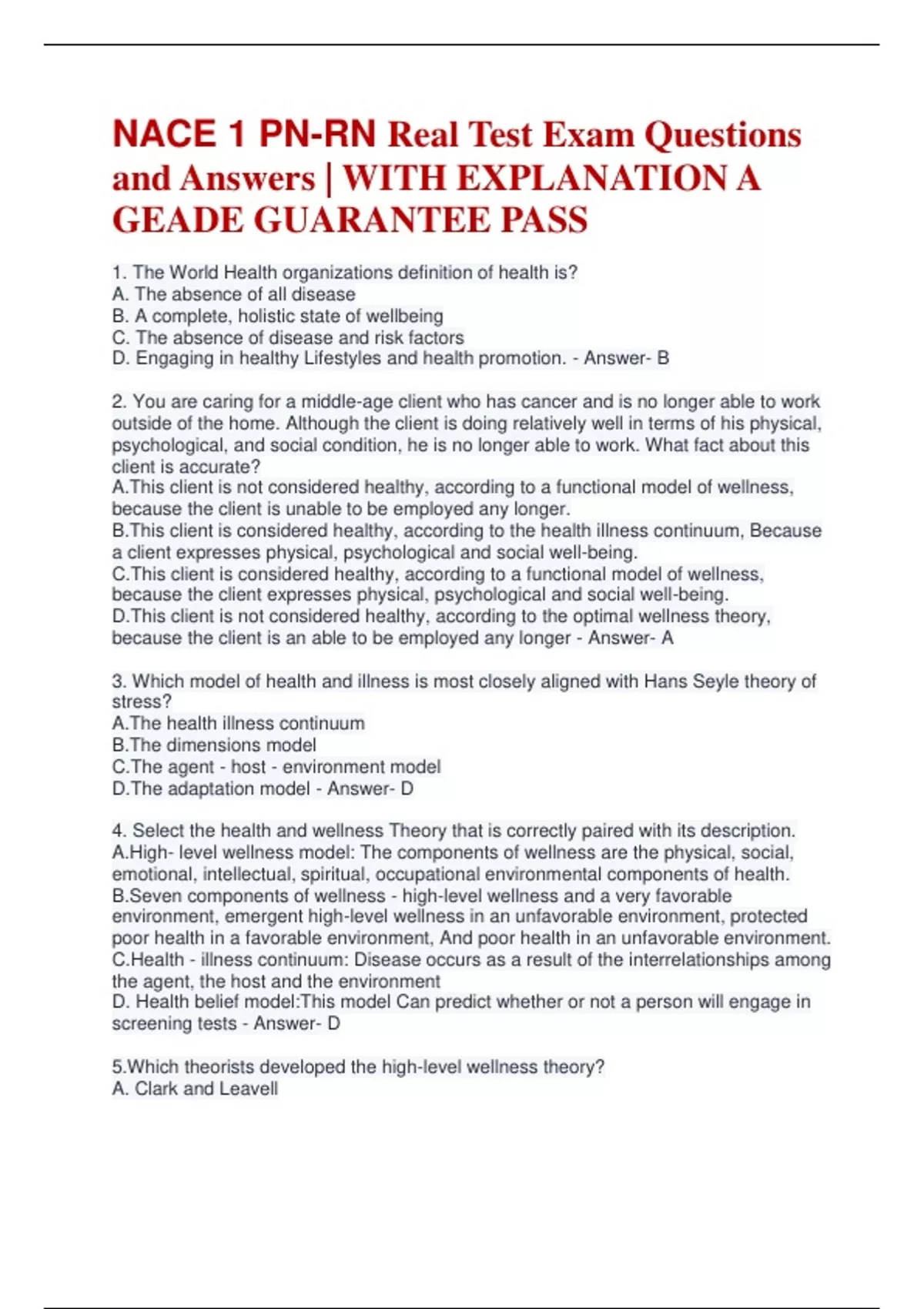 NACE 1 PN-RN Real Test Exam Questions and Answers | WITH EXPLANATION A GEADE GUARANTEE PASS 1. The World Health organizations definition of health is? A. The absence of all disease B. A complete, holistic state of wellbeing C. The absence of disease and risk factors D. Engaging in healthy Lifestyles and health promotion. - Answer- B 2. You are caring for a middle-age client who has cancer and is no longer able to work outside of the home. Although the client is doing relatively well in terms of his physical, psychological, and social condition, he is no longer able to work. What fact about this client is accurate? A.This client is not considered healthy, according to a functional model of wellness, because the client is unable to be employed any longer. B.This client is considered healthy, according to the health illness continuum, Because a client expresses physical, psychological and social well-being. C.This client is considered healthy, according to a functional model of wellness, because the client expresses physical, psychological and social well-being. D.This client is not considered healthy, according to the optimal wellness theory, because the client is an able to be employed any longer - Answer- A 3. Which model of health and illness is most closely aligned with Hans Seyle theory of stress? A.The health illness continuum B.The dimensions model C.The agent - host - environment model D.The adaptation model - Answer- D 4. Select the health and wellness Theory that is correctly paired with its description. A.High- level wellness model: The components of wellness are the physical, social, emotional, intellectual, spiritual, occupational environmental components of health. B.Seven components of wellness - high-level wellness and a very favorable environment, emergent high-level wellness in an unfavorable environment, protected poor health in a favorable environment, And poor health in an unfavorable environment. C.Health - illness continuum: Disease occurs as a result of the interrelationships among the agent, the host and the environment D. Health belief model:This model Can predict whether or not a person will engage in screening tests - Answer- D 5.Which theorists developed the high-level wellness theory? A. Clark and Leavell B. Halbert Dunn C. Anspaugh, Hamrick and Rosato D. Rosenstock and Becker - Answer- B 6. The clients level of motivation and commitment is impacted by many factors including emotions, affect, behavior specific cognition, the clients prior experiences, personal characteristics, feelings of self efficacy and the support of others according to which model of health and wellness? A. Seven components of wellness B. The dimensions model C. Penders Health promotion model D. The agent - host - environment model - Answer- C 7.The goal of nursing, according to which theory is to Facilitate protections against "penetration" and to facilitate "reconstitution "? A. The systems Model B. Orems self care theory C. The 21 nursing problems D. Interpersonal relations model - Answer- A 8. Madeleine Leininger Support which of the following nursing modes of intervention? A. Cultural practices and cultural respect B. Self care agency C. Cultural care restructuring and repatterning D.Universality - Answer- C 9.Which nursing theory is the most abstract? A. Leiningers Self care agency B. Rogers science of unitary human beings C.Neumans nature of nursing D. Hendersons goal attainment theory - Answer- B