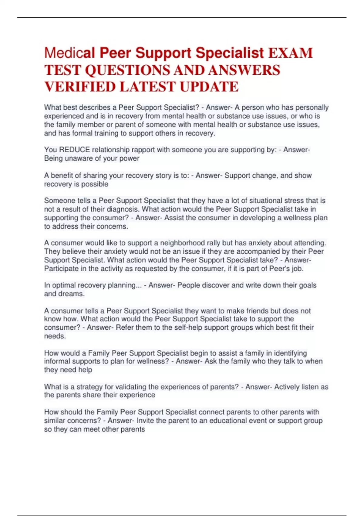Medical Peer Support Specialist EXAM TEST QUESTIONS AND ANSWERS VERIFIED LATEST UPDATE What best describes a Peer Support Specialist? - Answer- A person who has personally experienced and is in recovery from mental health or substance use issues, or who is the family member or parent of someone with mental health or substance use issues, and has formal training to support others in recovery. You REDUCE relationship rapport with someone you are supporting by: - Answer- Being unaware of your power A benefit of sharing your recovery story is to: - Answer- Support change, and show recovery is possible Someone tells a Peer Support Specialist that they have a lot of situational stress that is not a result of their diagnosis. What action would the Peer Support Specialist take in supporting the consumer? - Answer- Assist the consumer in developing a wellness plan to address their concerns. A consumer would like to support a neighborhood rally but has anxiety about attending. They believe their anxiety would not be an issue if they are accompanied by their Peer Support Specialist. What action would the Peer Support Specialist take? - Answer- Participate in the activity as requested by the consumer, if it is part of Peer's job. In optimal recovery planning... - Answer- People discover and write down their goals and dreams. A consumer tells a Peer Support Specialist they want to make friends but does not know how. What action would the Peer Support Specialist take to support the consumer? - Answer- Refer them to the self-help support groups which best fit their needs. How would a Family Peer Support Specialist begin to assist a family in identifying informal supports to plan for wellness? - Answer- Ask the family who they talk to when they need help What is a strategy for validating the experiences of parents? - Answer- Actively listen as the parents share their experience How should the Family Peer Support Specialist connect parents to other parents with similar concerns? - Answer- Invite the parent to an educational event or support group so they can meet other parents An example of a recovery-oriented approach is... - Answer- Focusing on wellness, ability and choice What are the basic five stages in the recovery process? - Answer- Pre-contemplation, Contemplation, Preparation, Action, Maintenance What is helpful at the Pre-contemplation stage? - Answer- Express caring, concern and desire for the person to have their best life What is helpful at the Action stage? - Answer- Help them carry out their plan, provide praise and reinforcement, and continue to be a source of moral support. What is recovery, according to the Substance Abuse Mental Health Services Administration (SAMHSA)? - Answer- A process of change through which individuals improve their health and wellness, live a self-directed life, and strive to reach their full potential. What are the four dimensions that support recovery, according to SAMHSA? - Answer- Health, home, purpose, and community What are some guiding principles of recovery as defined by SAMHSA? - Answer- Recovery emerges from hope, is person-driven, and occurs via many pathways