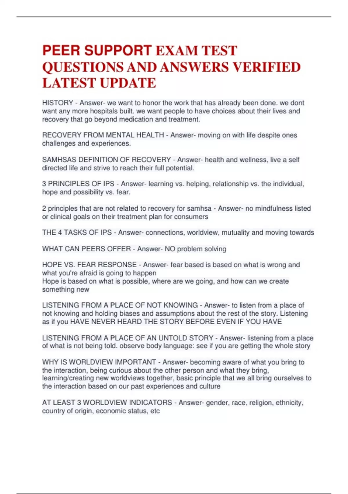 PEER SUPPORT EXAM TEST QUESTIONS AND ANSWERS VERIFIED LATEST UPDATE HISTORY - Answer- we want to honor the work that has already been done. we dont want any more hospitals built. we want people to have choices about their lives and recovery that go beyond medication and treatment. RECOVERY FROM MENTAL HEALTH - Answer- moving on with life despite ones challenges and experiences. SAMHSAS DEFINITION OF RECOVERY - Answer- health and wellness, live a self directed life and strive to reach their full potential. 3 PRINCIPLES OF IPS - Answer- learning vs. helping, relationship vs. the individual, hope and possibility vs. fear. 2 principles that are not related to recovery for samhsa - Answer- no mindfulness listed or clinical goals on their treatment plan for consumers THE 4 TASKS OF IPS - Answer- connections, worldview, mutuality and moving towards WHAT CAN PEERS OFFER - Answer- NO problem solving HOPE VS. FEAR RESPONSE - Answer- fear based is based on what is wrong and what you're afraid is going to happen Hope is based on what is possible, where are we going, and how can we create something new