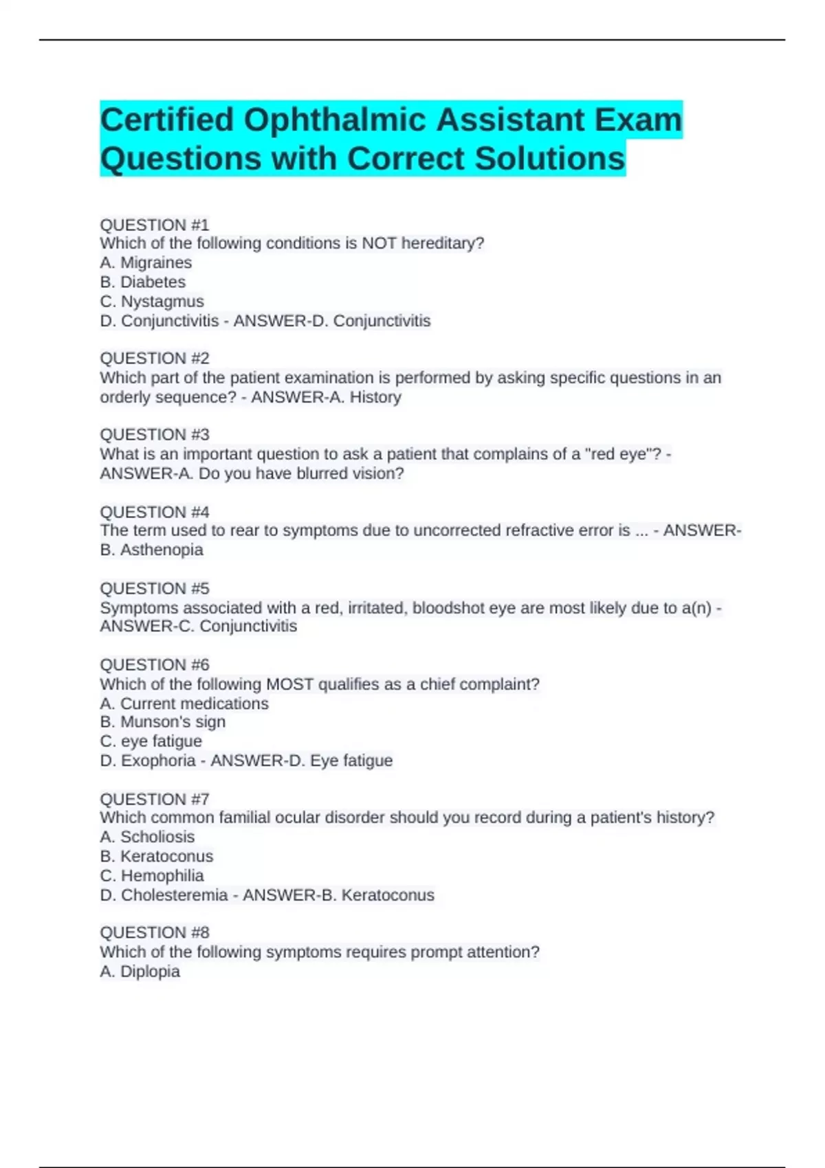 D. Exophoria - ANSWER-D. Eye fatigue