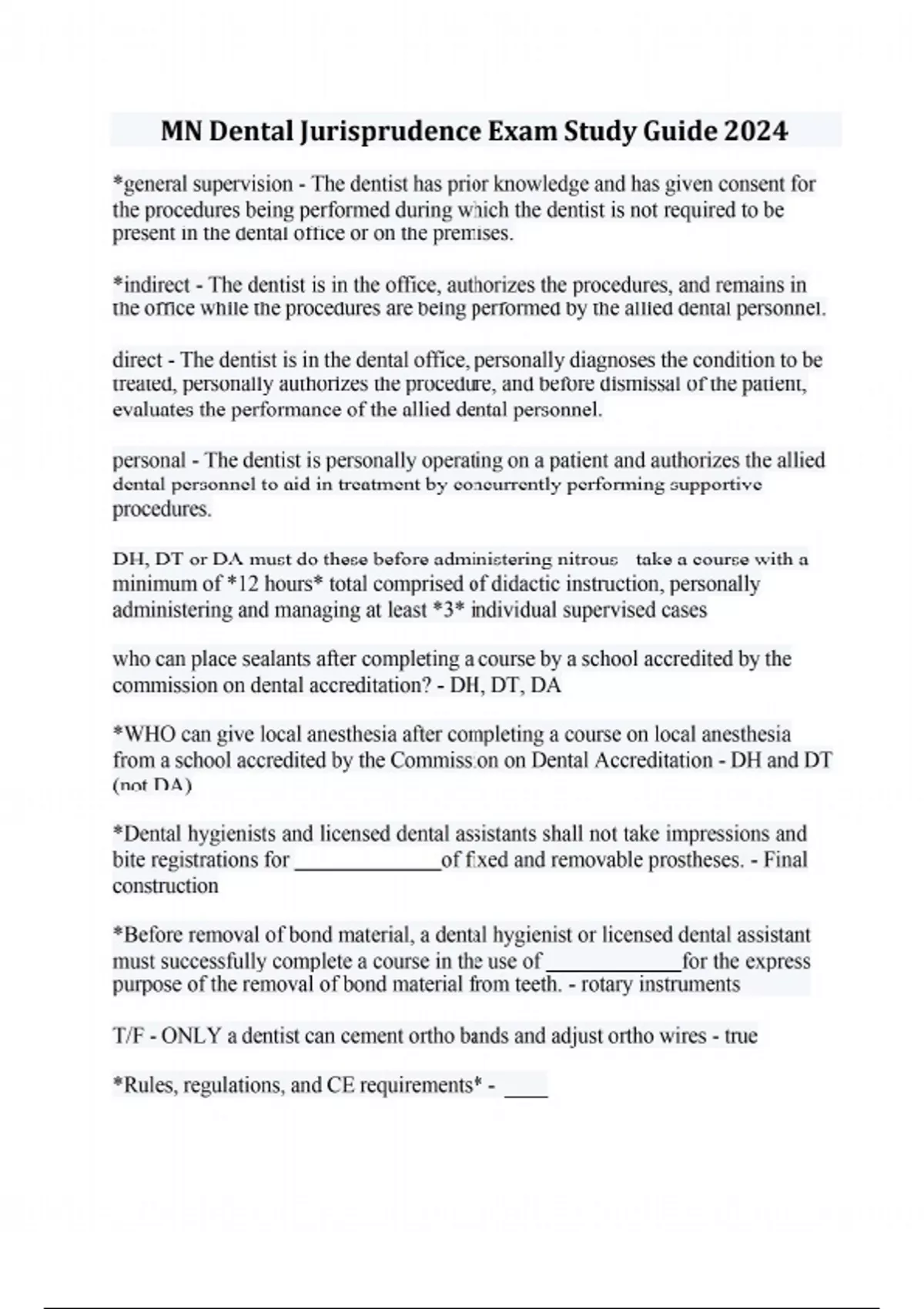 *general supervision - The dentist has prior knowledge and has given consent for the procedures being performed during which the dentist is not required to be present in the dental office or on the premises. *indirect - The dentist is in the office, authorizes the procedures, and remains in the office while the procedures are being performed by the allied dental personnel. direct - The dentist is in the dental office, personally diagnoses the condition to be treated, personally authorizes the procedure, and before dismissal of the patient, evaluates the performance of the allied dental personnel. personal - The dentist is personally operating on a patient and authorizes the allied dental personnel to aid in treatment by concurrently performing supportive procedures. DH, DT or DA must do these before administering nitrous - take a course with a minimum of *12 hours* total comprised of didactic instruction, personally administering and managing at least *3* individual supervised cases who can place sealants after completing a course by a school accredited by the commission on dental accreditation? - DH, DT, DA *WHO can give local anesthesia after completing a course on local anesthesia from a school accredited by the Commission on Dental Accreditation - DH and DT (not DA) *Dental hygienists and licensed dental assistants shall not take impressions and bite registrations for of fixed and removable prostheses. - Final construction T/F - ONLY a dentist can cement ortho bands and adjust ortho wires - true *Rules, regulations, and CE requirements* - *can a dentist accept money for making a referral (renumeration = $) to another dentist? - nope *the patient can be terminated for: - - pt failure to comply with treatment or professional advice (ex: advanced perio) - consistent tardiness or failed appts - failure to pay for services rendered - behavior mngmt issues *Can a LDA scale and clean mandibular anteriors on a pediatric patient? - NO The LDA and DDS would both be held accountable *Who could be in trouble by the Board of Dentistry if a DH/LDA practices beyond their scope of practice, even when the DDS did NOT request them to and the DH/LDA acted on their own - both the DDS and DH/LDA Ad: "Our practice specialized in cosmetic dentistry, *promising* *superior* *results* in the quest to achieve your perfect smile" What is wrong w/ the above ad? - DDS cannot say they are SUPERIOR and cannot PROMISE the results of a tx. They are creating a false/unjustified expectation. *Also, cosmetic dentistry is not recognized as a 'specialty' by the ADA* In advertising a dental office, the DDS cannot use terms such as "top" or "best". They cannot make a claim that a survey, ballot, or poll constitutes a ranking for who they are or what they do; ex) "the top 15%" or "voted best.." T/F - true 5 components of CPR training - -AED -Barrier mask or bag for ventilation -Foreign body airway obstruction -Two person rescuer -Adult, child, and infant CPR Good Samaritan Law - a person at the scene of an emergency who knows that another person is exposed to or has suffer harm shall give *reasonable assistance* to the exposed person Criminal law - law that deals with crime and the legal punishment of criminal offenses (crime against society) Civil law - deal with disputes between individuals, organizations, or between the two, in which compensation is awarded to the victim What actions would cause an immediate suspension of a Dental Professional License? - 1. Dependence on alcohol, drugs, or other substances 2. Writing unauthorized prescriptions *How many CE credits does a LDA, DDS, DT and DH need to have in a 2 year period? - 25 for LDA and DH 50 for DDS and DT's fundamental credits - directly related to clinical practice of dentistry *minimum of 15 credits for LDA and DH; 30 for DDS and dental therapists Core Subjects (fundamental credits) - areas of knowledge that relate to public *safety* and professionalism *minimum of 2 different core subjects needed in 2 yrs *what are core subjects?? - -Record Keeping -Ethics -Infection Control -Patient Communication -Management of med. emergencies -Diagnosis and tx. planning (optional for DH/LDA) CPR is a credit - Fundamental; must be updated every 2 yrs *self assessment is a credit - Fundamental; printed from ADA website; usually updated every 2yrs. completed and put in professional portfolio; 1 credit Can all of your credits be earned in the fundamental category? - yes, but they cannot all be in the elective category *elective credits - activities directly related to, or *supportive* of the practice of dentistry; Max. of 10 credits for DH/LDA; 20 for DDS and dental therapists ex) Self-study-scholarly articles Scholarly activities- presentations Volunteering/Community Service General Attendance- 3 credits for a state or national dental convention BOD will randomly select individuals for an audit; you will be notified by letter and have days to submit COPIES of your CE record - 60 days (never send an original) *Each dental professional is required to keep documentation of their CE for the current 2 year cycle AND the previous year cycle - past 2 year cycle *all dental professionals must notify the board of dentistry within of a name or address change - 30 days ****T/F : must display annual renewal certificate w/ license in plain sight for pts to see. When renewing license, copies can be *requested* if one is employed at multiple practices. (One must carry a wallet copy if they float to variety of offices) - True (you cannot make copies yourself) *All DHCP must renew their license every on the date when they originally got their license - 2 years When is reading a professional article considered a fundamental credit and when is it an elective credit? - A professional article w/ a post test is considered *fundamental* Reading a professional article for the information is considered *elective* the board can grant a GUEST LICENSE for a DA, DDS, DH if the following conditions are met - 1