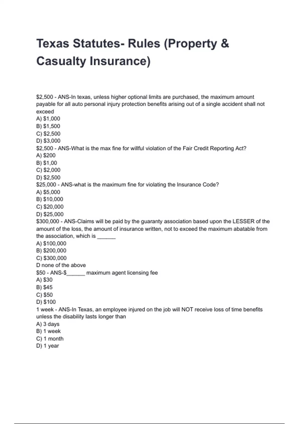 Texas Statutes- Rules (Property & Casualty Insurance) QUESTIONS AND CORRECT DETAILED ANSWERS |ALREADY GRADED A+
