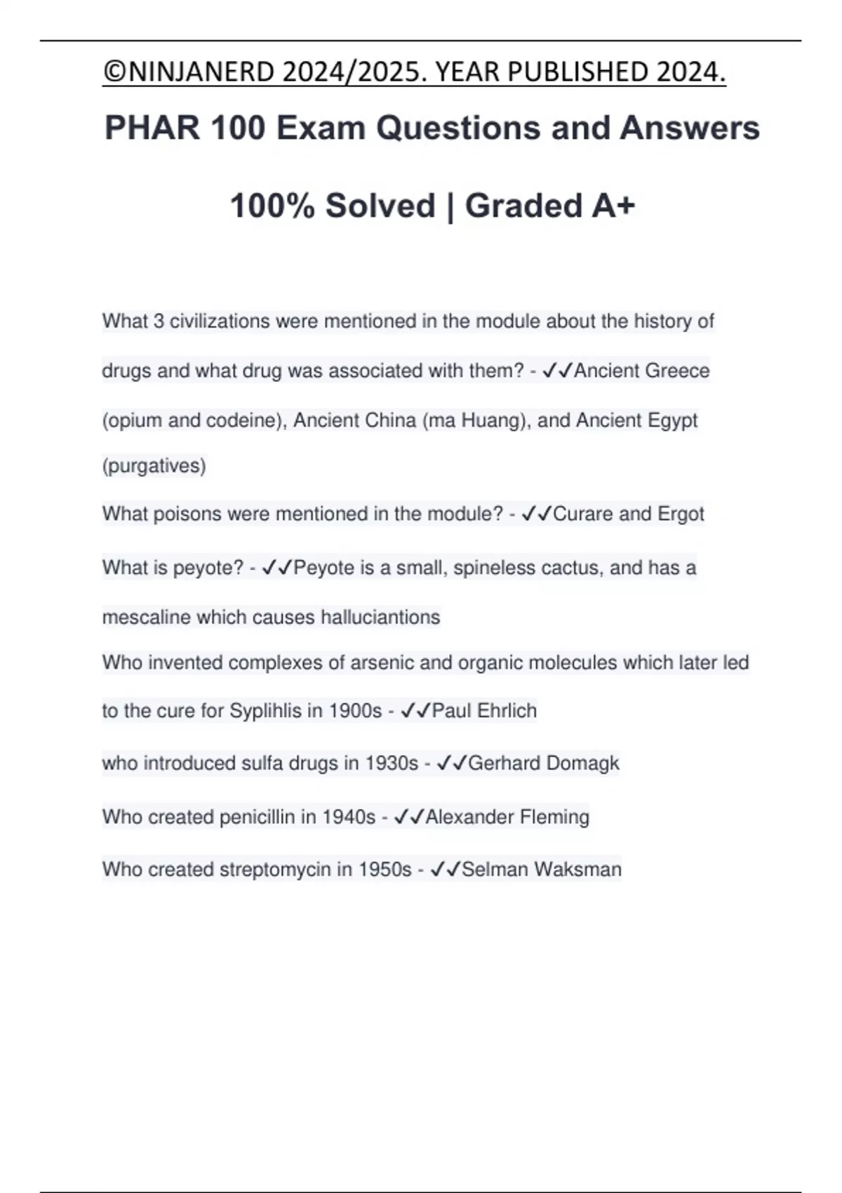 PHAR 100 Exam Questions and Answers 100% Solved | Graded A+ What 3 civilizations were mentioned in the module about the history of drugs and what drug was associated with them? - Ancient Greece (opium and codeine), Ancient China (ma Huang), and Ancient Egypt (purgatives) What poisons were mentioned in the module? - Curare and Ergot What is peyote? - Peyote is a small, spineless cactus, and has a mescaline which causes halluciantions Who invented complexes of arsenic and organic molecules which later led to the cure for Syplihlis in 1900s - Paul Ehrlich who introduced sulfa drugs in 1930s - Gerhard Domagk Who created penicillin in 1940s - Alexander Fleming Who created streptomycin in 1950s - Selman Waksman