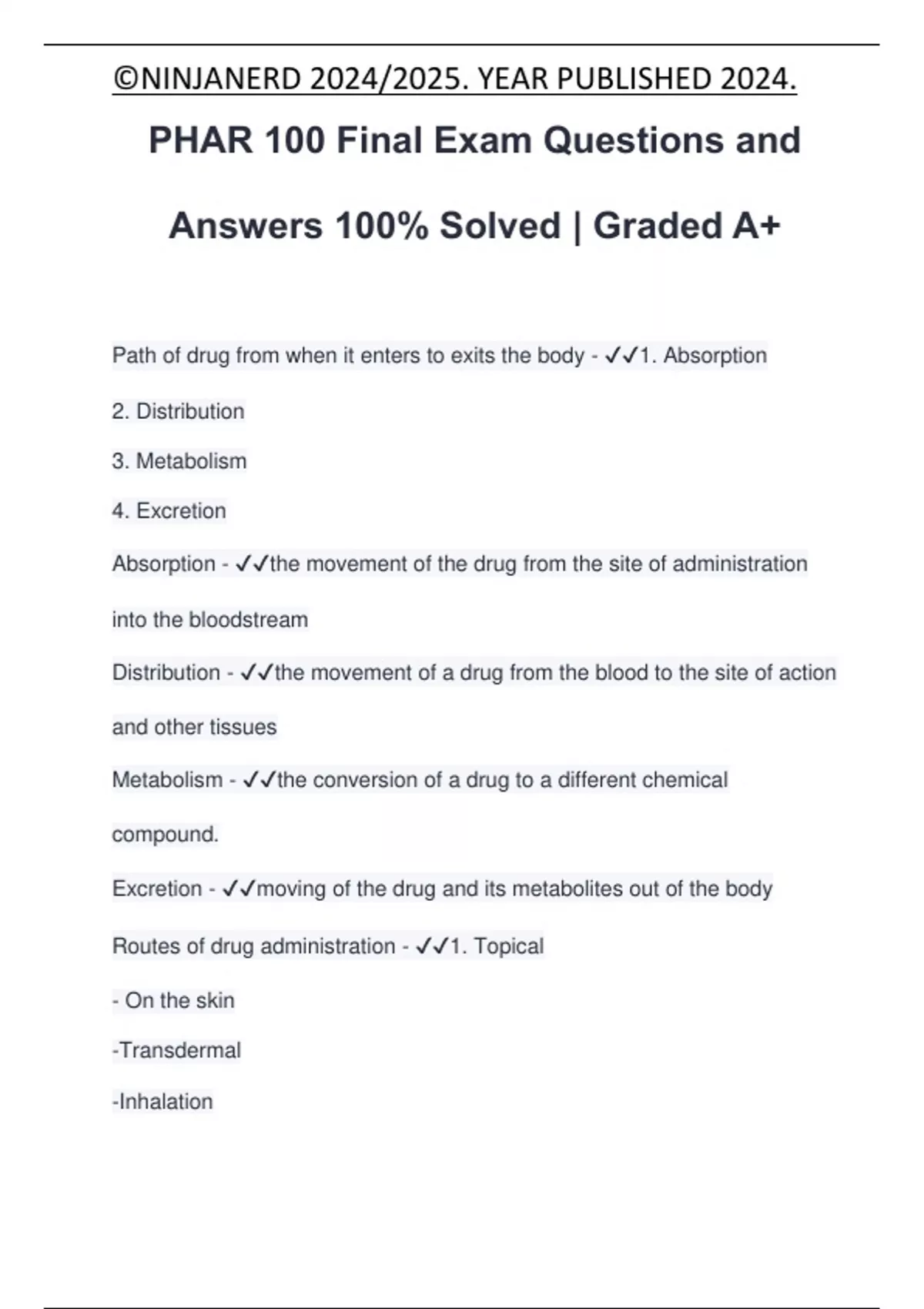 PHAR 100 Final Exam Questions and Answers 100% Solved | Graded A+ Path of drug from when it enters to exits the body - 1. Absorption 2. Distribution 3. Metabolism 4. Excretion Absorption - the movement of the drug from the site of administration into the bloodstream Distribution - the movement of a drug from the blood to the site of action and other tissues Metabolism - the conversion of a drug to a different chemical compound. Excretion - moving of the drug and its metabolites out of the body Routes of drug administration - 1. Topical - On the skin -Transdermal -Inhalation