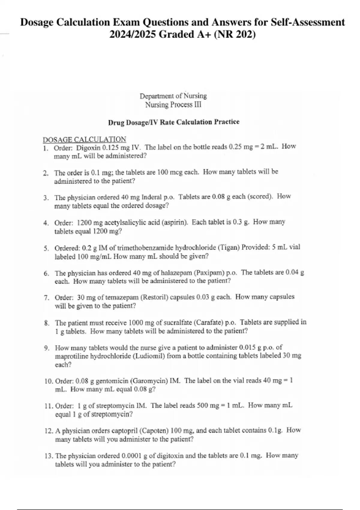 Dosage Calculation Exam Questions and Answers for Self-Assessment 2024/2025 Graded A+ (NR 202)