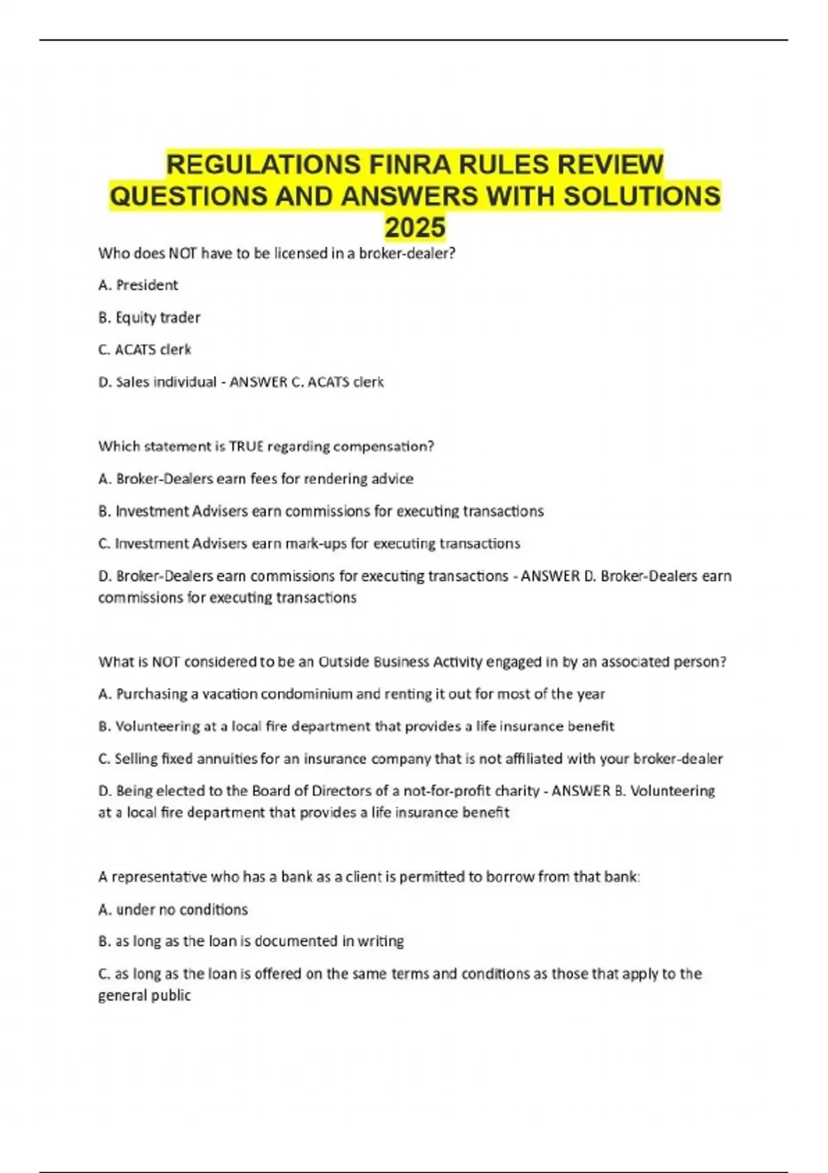 REGULATIONS FINRA RULES REVIEW QUESTIONS AND ANSWERS WITH SOLUTIONS 2025