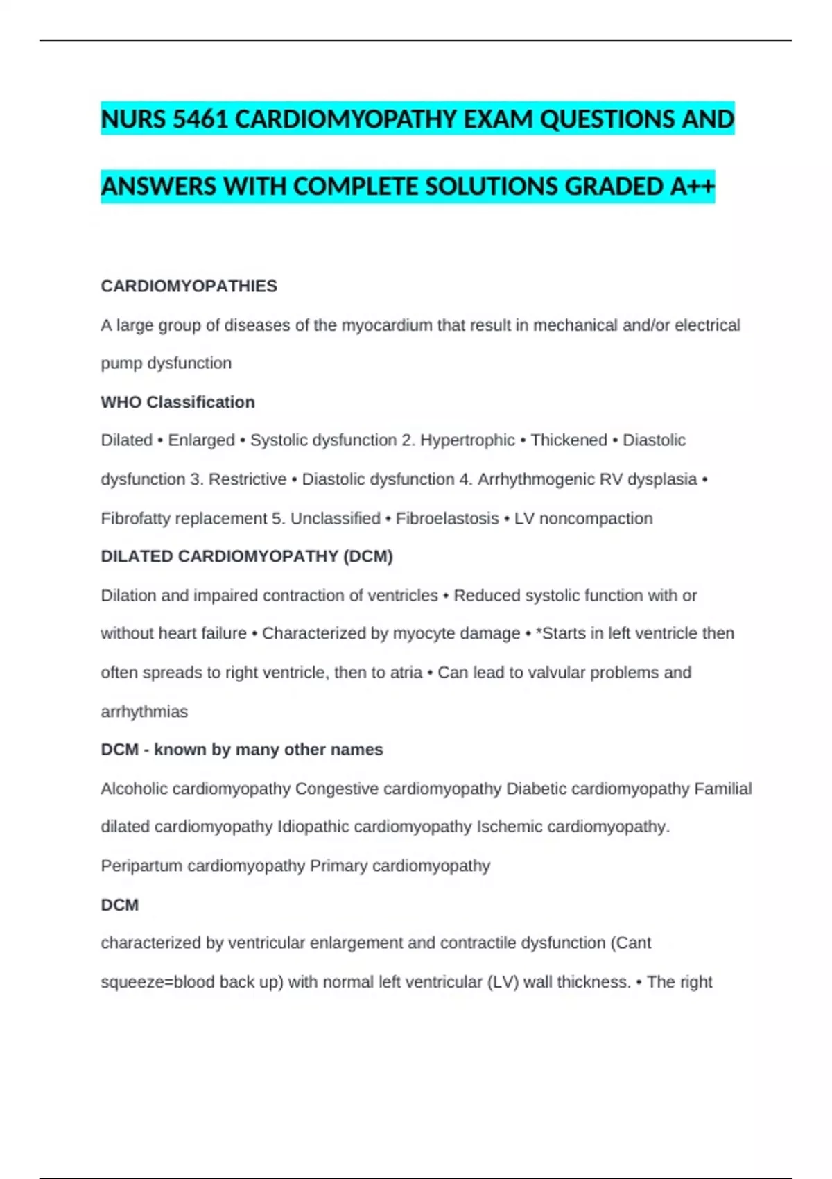 NURS 5461 CARDIOMYOPATHY EXAM QUESTIONS AND ANSWERS WITH COMPLETE SOLUTIONS GRADED A++ CARDIOMYOPATHIES A large group of diseases of the myocardium that result in mechanical and/or electrical pump dysfunction WHO Classification Dilated • Enlarged • Systolic dysfunction 2. Hypertrophic • Thickened • Diastolic dysfunction 3. Restrictive • Diastolic dysfunction 4. Arrhythmogenic RV dysplasia • Fibrofatty replacement 5. Unclassified • Fibroelastosis • LV noncompaction DILATED CARDIOMYOPATHY (DCM) Dilation and impaired contraction of ventricles • Reduced systolic function with or without heart failure • Characterized by myocyte damage • *Starts in left ventricle then often spreads to right ventricle, then to atria • Can lead to valvular problems and arrhythmias DCM - known by many other names Alcoholic cardiomyopathy Congestive cardiomyopathy Diabetic cardiomyopathy Familial dilated cardiomyopathy Idiopathic cardiomyopathy Ischemic cardiomyopathy. Peripartum cardiomyopathy Primary cardiomyopathy DCM characterized by ventricular enlargement and contractile dysfunction (Cant squeeze=blood back up) with normal left ventricular (LV) wall thickness. • The right ventricle may also be dilated and dysfunctional. • Dilated cardiomyopathy is the third most common cause of heart failure and the most frequent reason for heart transplantation. Accounts for 10,000 death annually. • 1 in 9 deaths in US, heart failure is mentioned on death certificate DCM SIGNS & SXS Indicator of the severity • Fatigue • Dyspnea on exertion, shortness of breath • Orthopnea, paroxysmal nocturnal dyspnea • Increasing edema, weight, or abdominal girth DCM PE FINDINGS • signs of heart failure and volume overload • Tachypnea • Tachycardia • Hypertension • Signs of hypoxia (eg, cyanosis, clubbing) • Jugular venous distension (JVD) • Pulmonary edema (crackles and/or wheezes) • S 3 gallop • Enlarged liver • Peripheral edema DCM WORKUP • Complete blood count • Metabolic panel • Thyroid function tests • Cardiac biomarkers • B-type natriuretic peptide assay • Chest radiography • Echocardiography • Cardiac magnetic resonance imaging (MRI) • Electrocardiography (ECG) • Endomyocardial Biopsy if cannot find cause DCM MANAGEMENT • Essentially the same as treatment of chronic heart failure • Angiotensin-converting enzyme (ACE) inhibitors ('pril)• Angiotensin II receptor blockers ('tan) (ARBs) • Beta-blockers • Aldosterone antagonists Eplerenone)• Cardiac glycosides • Diuretics •