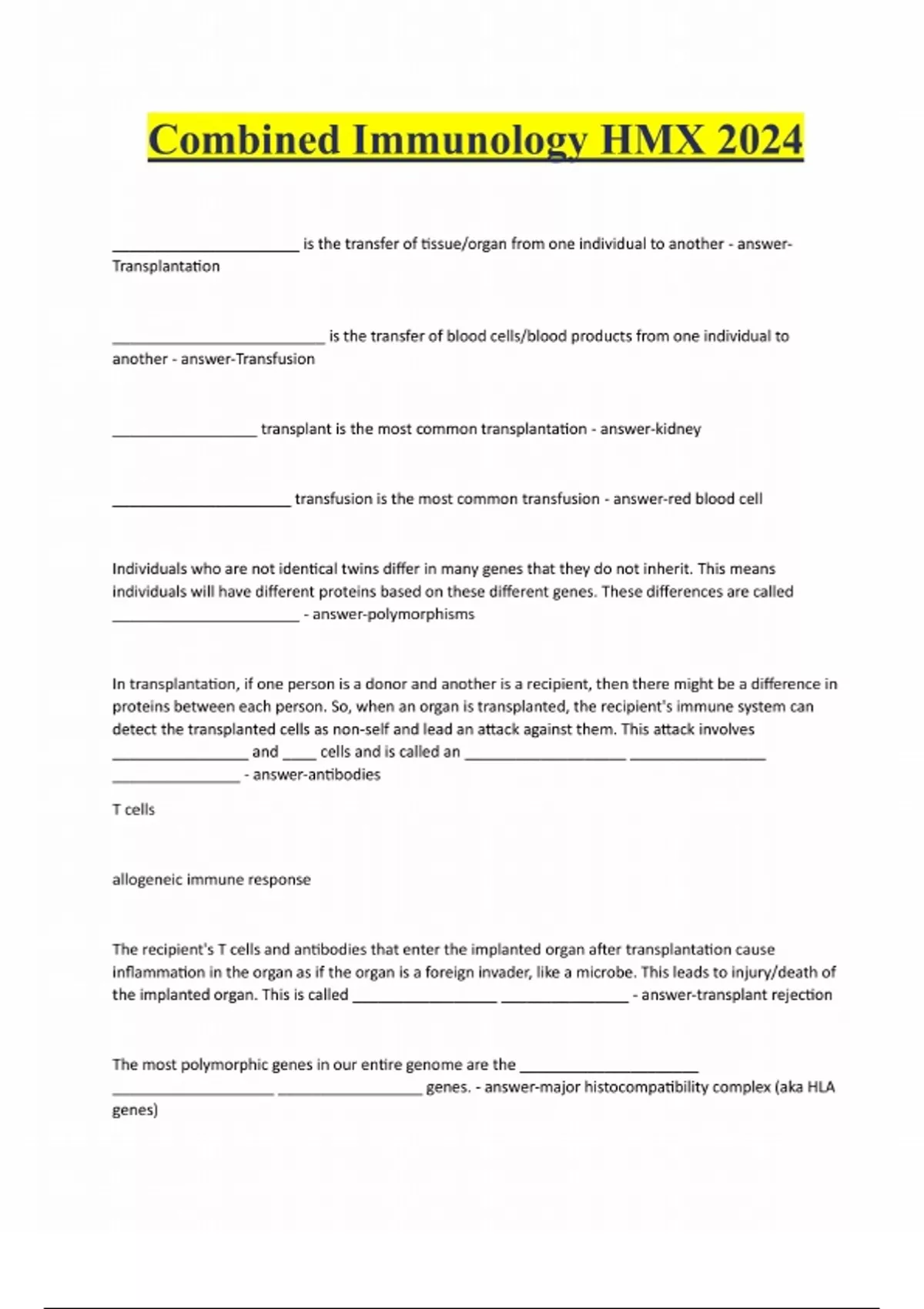 Combined Immunology HMX 2024 ______________________ is the transfer of tissue/organ from one individual to another - answerTransplantation _________________________ is the transfer of blood cells/blood products from one individual to another - answer-Transfusion _________________ transplant is the most common transplantation - answer-kidney _____________________ transfusion is the most common transfusion - answer-red blood cell Individuals who are not identical twins differ in many genes that they do not inherit. This means individuals will have different proteins based on these different genes. These differences are called ______________________ - answer-polymorphisms In transplantation, if one person is a donor and another is a recipient, then there might be a difference in proteins between each person. So, when an organ is transplanted, the recipient's immune system can detect the transplanted cells as non-self and lead an attack against them. This attack involves ________________ and ____ cells and is called an ___________________ ________________ _______________ - answer-antibodies T cells allogeneic immune response The recipient's T cells and antibodies that enter the implanted organ after transplantation cause inflammation in the organ as if the organ is a foreign invader, like a microbe. This leads to injury/death of the implanted organ. This is called _________________ _______________ - answer-transplant rejection