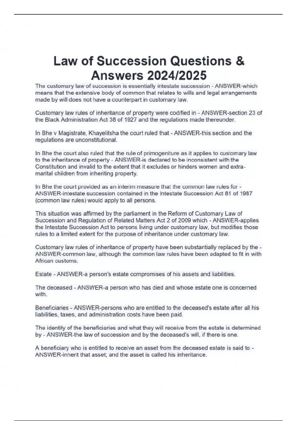 Law of Succession Questions & Answers 2024/2025 The customary law of succession is essentially intestate succession - ANSWER-which means that the extensive body of common that relates to wills and legal arrangements made by will does not have a counterpart in customary law. s of inheritance of property were codified in - ANSWER-section 23 of the Black Administration Act 38 of 1927 and the regulations made thereunder. In Bhe v Magistrate, Khayelitsha the court ruled that - ANSWER-this section and the regulations are unconstitutional. In Bhe the court also ruled that the rule of primogeniture as it applies to customary law to the inheritance of property - ANSWER-is declared to be inconsistent with the Constitution and invalid to the extent that it excludes or hinders women and extra-marital children from inheriting property. In Bhe the court provided as an interim measure that the common law rules for - ANSWER-intestate succession contained in the Intestate Succession Act 81 of 1987 (common law rules) would apply to all persons. This situation was affirmed by the parliament in the Reform of Customary Law of Succession and Regulation of Related Matters Act 2 of 2009 which - ANSWER-applies the Intestate Succession Act to persons living under customary law, but modifies those rules to a limited extent for the purpose of inheritance under customary law. Customary law rules of inheritance of property have been substantially replaced by the - ANSWER-common law, although the common law rules have been adapted to fit in with African customs. Estate - ANSWER-a person's estate compromises of his assets and liabilities. The deceased - ANSWER-a person who has died and whose estate one is concerned with. Beneficiaries - ANSWER-persons who are entitled to the deceased's estate after all his liabilities, taxes, and administration costs have been paid. The identity of the beneficiaries and what they will receive from the estate is determined by - ANSWER-the law of succession and by the deceased's will, if there is one. A beneficiary who is entitled to receive an asset from the deceased estate is said to - ANSWER-inherit that asset; and the asset is called his inheritance. The beneficiary is said to - ANSWER-succeed the deceased. The beneficiary is said to - ANSWER-succeed the deceased. A will is also called a - ANSWER-testament or a last will and testament. If the deceased has left a valid will disposing if his assets - ANSWER-he is referred to as the testator. A will is a document made by the testator in which he stipulates - ANSWER-who his beneficiaries will be on his death and what they will each inherit from him. If a person dies leaving a valid will, then the devolution of his estate will - ANSWER-take place in accordance with the law of testate succession, in terms of which the wishes of the testator as expressed in the will are given effect to. Testate succession is also called - ANSWER-testamentary succession. If a person dies without leaving a (valid) will, then the rules of the - ANSWER-law of intestate succession determine who will inherit. The estate is said to devolve in accordance with the rules of intestacy. An executor - ANSWER-the person who attends the process of gathering up the deceased's assets, attending to payment of his liabilities and taxes, and distributing what is left to the beneficiaries. Executor nominated in the will is referred to as - ANSWER-an executor testamentary. Master of High Court appoints the the executor by - ANSWER-issuing documents called letters of executorship. Winding up - ANSWER-is the administration of the deceased estate. Winding up is also referred to as - ANSWER-the administration of the estate. Executor dative - ANSWER-executor chosen if there was no will. Preliminary inventory - ANSWER-list of the major assets. Estate account - ANSWER-standardized documents of summarized list of assets and liabilities and what is left for distribution. An executor is required to provide security to the Master as - ANSWER-a guarantee against stealing the assets of the estate. Executor's remuneration - ANSWER-3,5% of the value of the assets of the estate at CONTINUES....