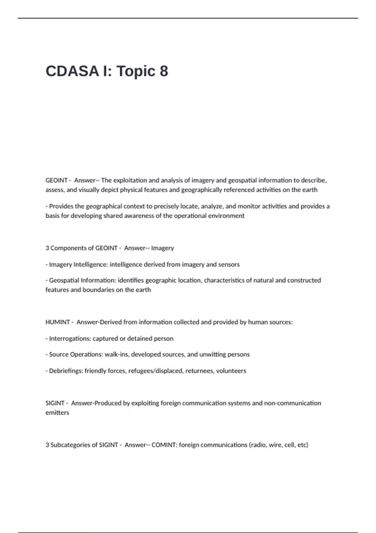 HUMINT - Answer-Derived from information collected and provided by human sources: