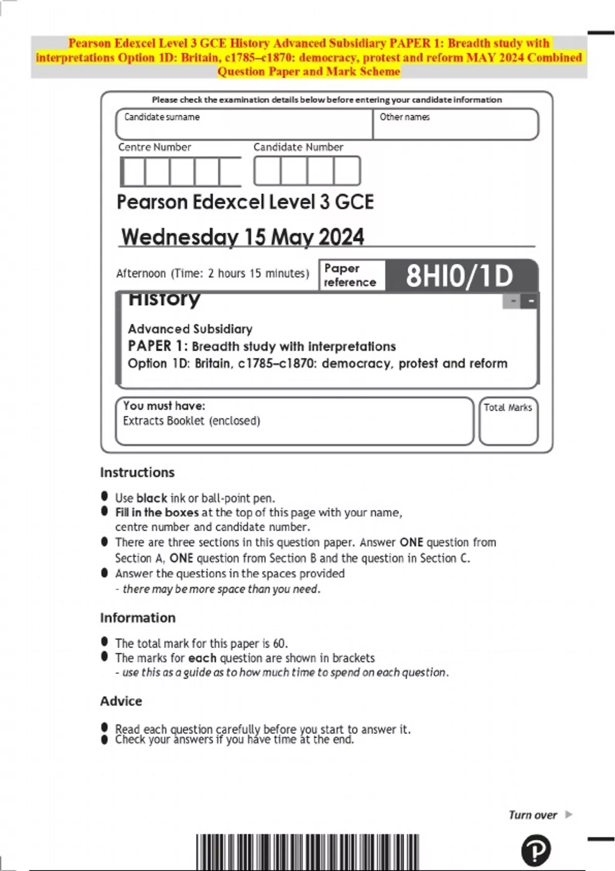 Pearson Edexcel Level 3 GCE History Advanced Subsidiary PAPER 1: Breadth study with interpretations Option 1D: Britain, c1785–c1870: democracy, protest and reform MAY 2024 Combined Question Paper and Mark Scheme