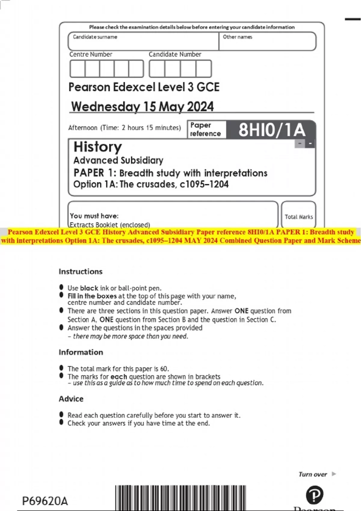 Pearson Edexcel Level 3 GCE History Advanced Subsidiary Paper reference 8HI0/1A PAPER 1: Breadth study with interpretations Option 1A: The crusades, c1095–1204 MAY 2024 Combined Question Paper and Mark Scheme