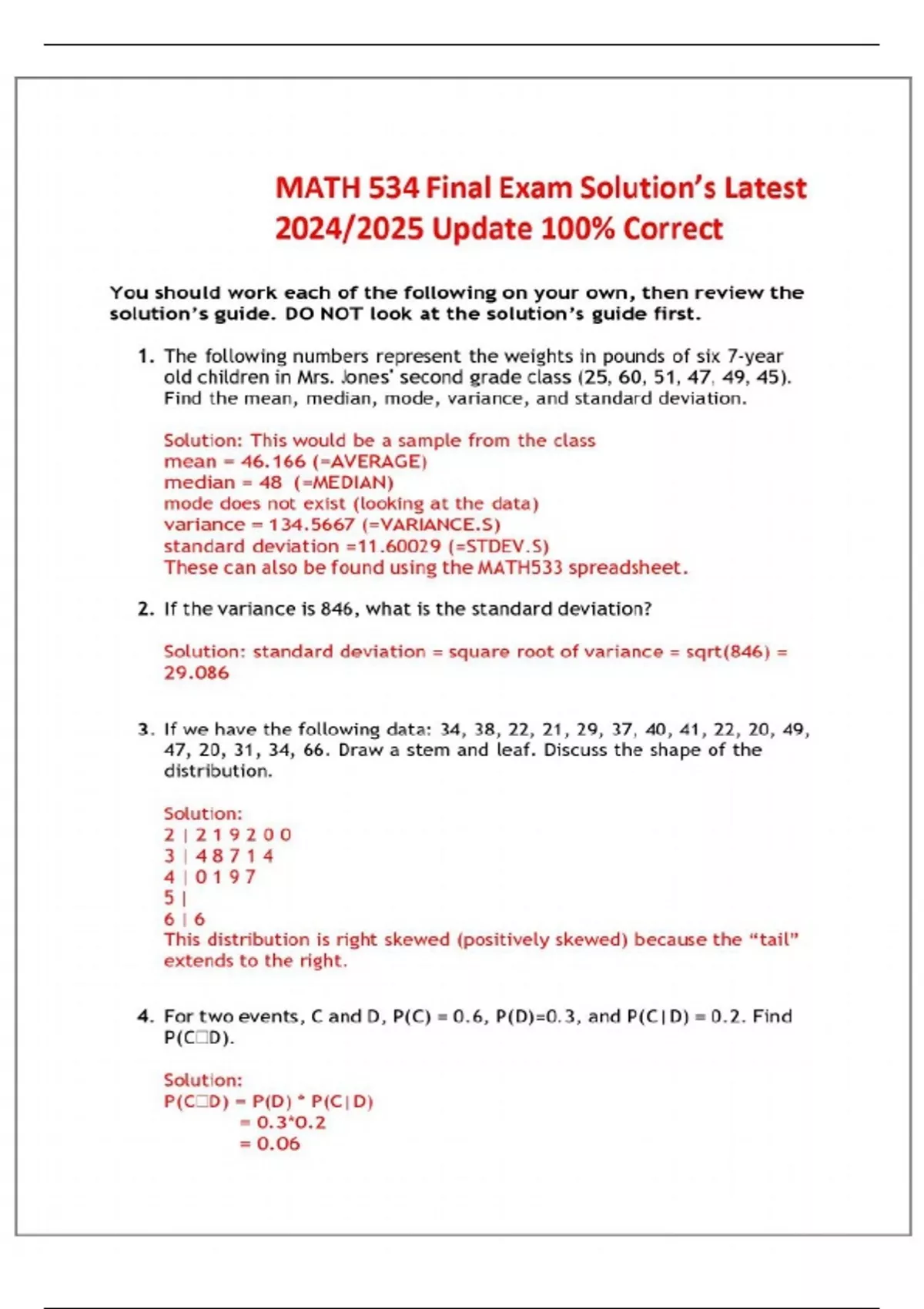 MATH 534 Final Exam Solution’s Latest 2024/2025 Update 100% Correct MATH 534 Final Exam Solution’s