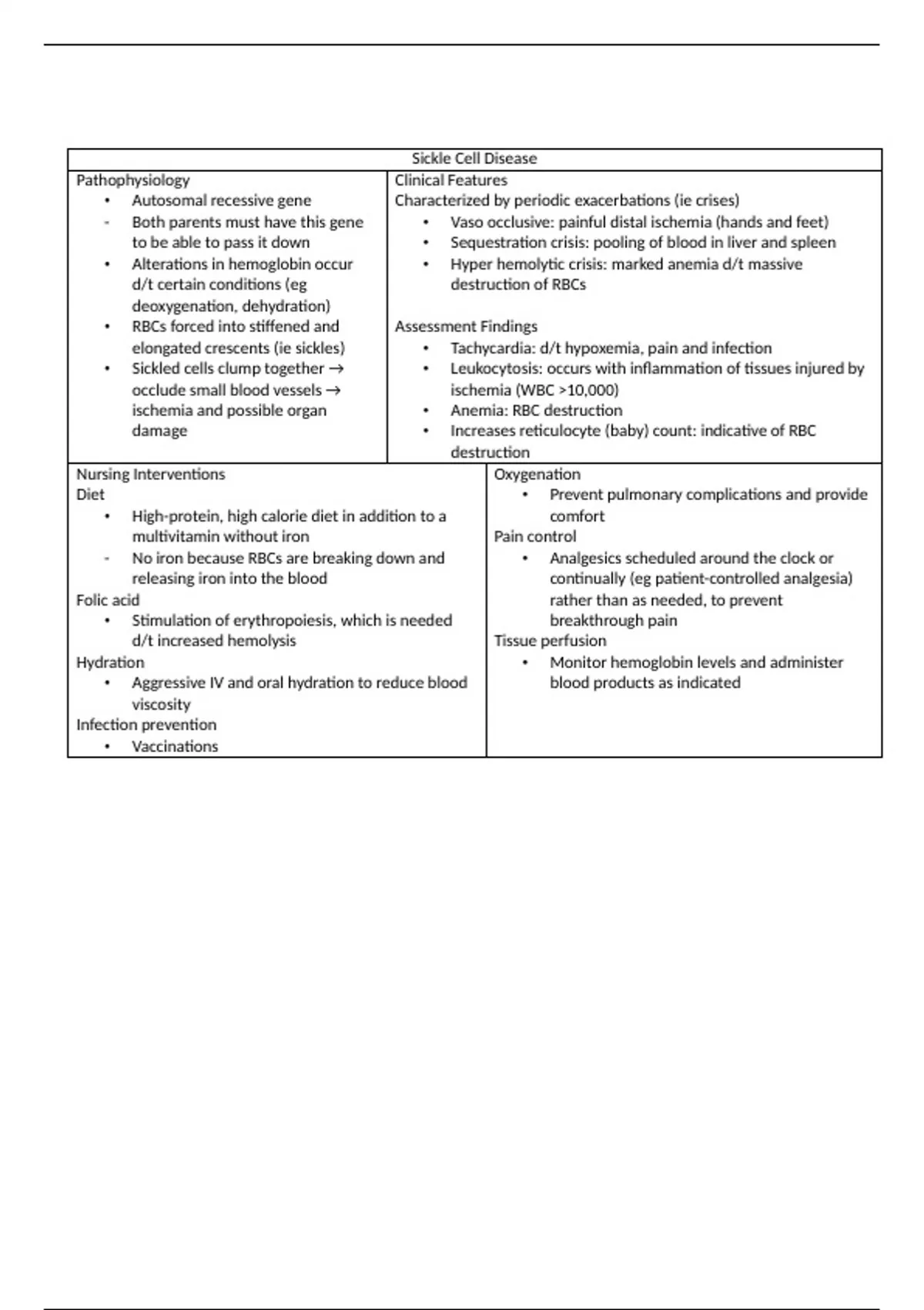 - No iron because RBCs are breaking down and • Analgesics scheduled around the clock or