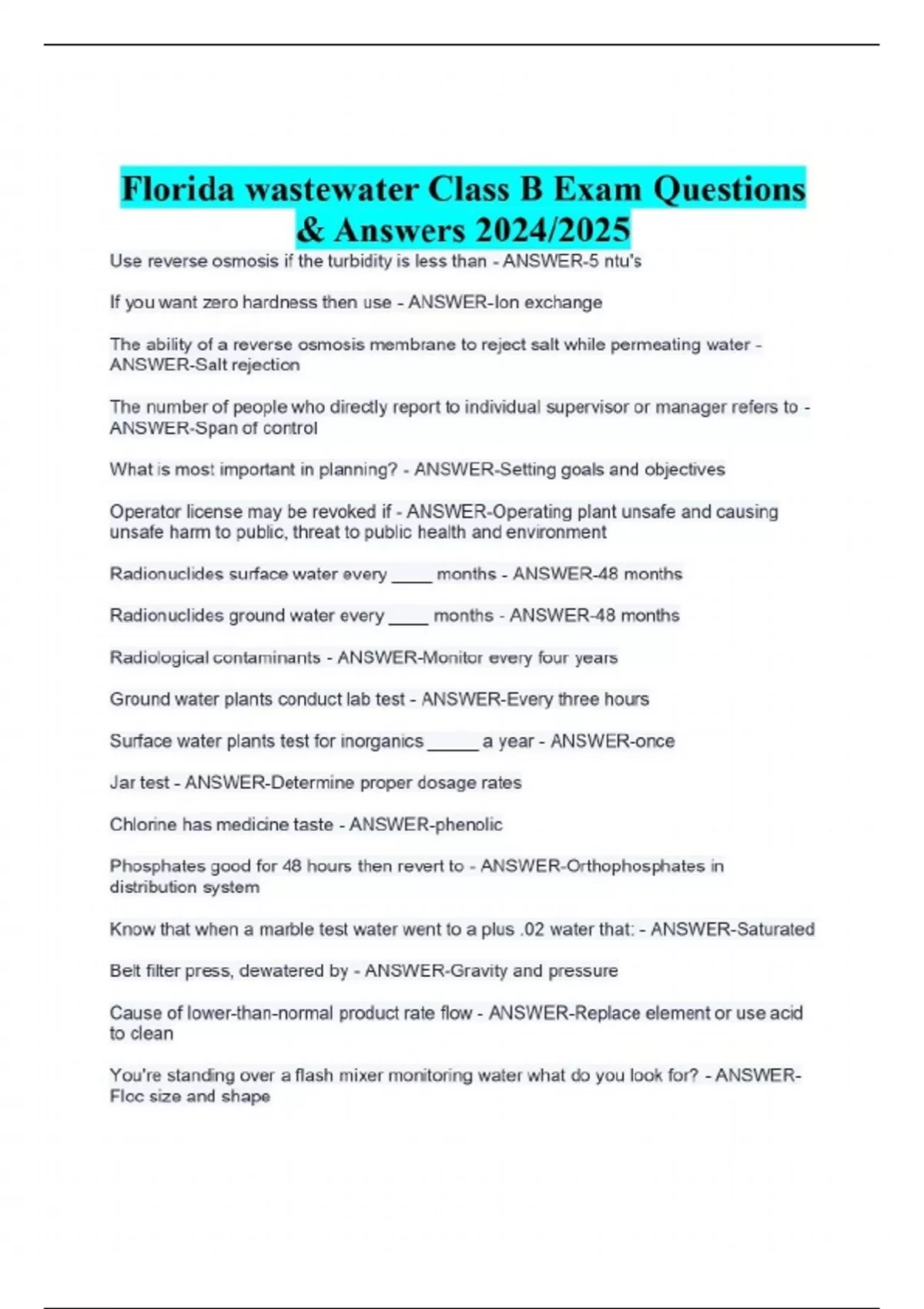 Florida wastewater Class B Exam Questions & Answers 2024/2025 Use reverse osmosis if the turbidity is less than - ANSWER-5 ntu's If you want zero hardness then use - ANSWER-Ion exchange The ability of a reverse osmosis membrane to reject salt while permeating water - ANSWER-Salt rejection The number of people who directly report to individual supervisor or manager refers to - ANSWER-Span of control What is most important in planning? - ANSWER-Setting goals and objectives Operator license may be revoked if - ANSWER-Operating plant unsafe and causing unsafe harm to public, threat to public health and environment Radionuclides surface water every ____ months - ANSWER-48 months ground water every ____ months - ANSWER-48 months Radionuclides Radiological contaminants - ANSWER-Monitor every four years Ground water plants conduct lab test - ANSWER-Every three hours Surface water plants test for inorganics _____ a year - ANSWER-once Jar test - ANSWER-Determine proper dosage rates Chlorine has medicine taste - ANSWER-phenolic Phosphates good for 48 hours then revert to - ANSWER-Orthophosphates in distribution system Know that when a marble test water went to a plus .02 water that: - ANSWER-Saturated Belt filter press, dewatered by - ANSWER-Gravity and pressure Cause of lower-than-normal product rate flow - ANSWER-Replace element or use acid to clean You're standing over a flash mixer monitoring water what do you look for? - ANSWER-Floc size and shape CONTINUES...