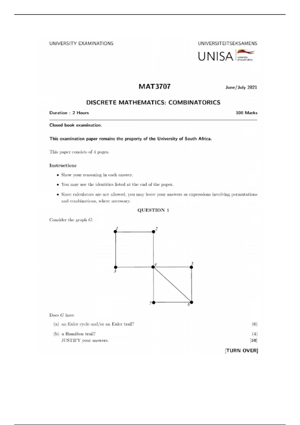 This document contains the final exam for MAT3707, Discrete Mathematics Combinatorics, for the June-July 2021 session