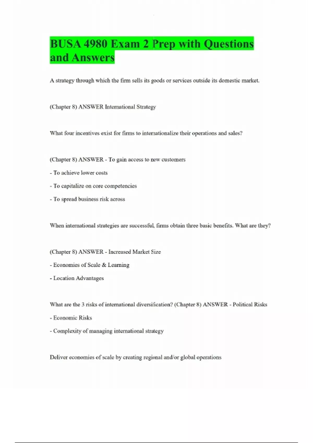 BUSA 4980 Exam 2 Prep with Questions and Answers A strategy through which the firm sells its goods or services outside its domestic market. (Chapter 8) ANSWER International Strategy What four incentives exist for firms to internationalize their operations and sales? (Chapter 8) ANSWER - To gain access to new customers - To achieve lower costs - To capitalize on core competencies - To spread business risk across When international strategies are successful, firms obtain three basic benefits. What are they? (Chapter 8) ANSWER - Increased Market Size - Economies of Scale & Learning - Location Advantages What are the 3 risks of international diversification? (Chapter 8) ANSWER - Political Risks - Economic Risks - Complexity of managing international strategy Deliver economies of scale by creating regional and/or global operations