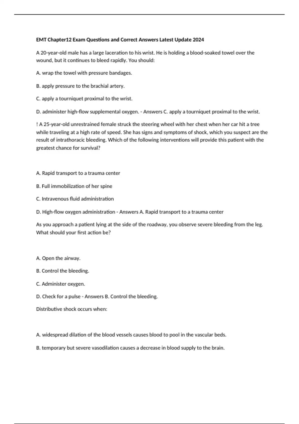 EMT Chapter12 Exam Questions and Correct Answers Latest Update 2024 A 20-year-old male has a large laceration to his wrist. He is holding a blood-soaked towel over the wound, but it continues to bleed rapidly. You should: A. wrap the towel with pressure bandages. B. apply pressure to the brachial artery. C. apply a tourniquet proximal to the wrist. D. administer high-flow supplemental oxygen. - Answers C. apply a tourniquet proximal to the wrist. ! A 25-year-old unrestrained female struck the steering wheel with her chest when her car hit a tree while traveling at a high rate of speed. She has signs and symptoms of shock, which you suspect are the result of intrathoracic bleeding. Which of the following interventions will provide this patient with the greatest chance for survival? A. Rapid transport to a trauma center B. Full immobilization of her spine C. Intravenous fluid administration D. High-flow oxygen administration - Answers A. Rapid transport to a trauma center As you approach a patient lying at the side of the roadway, you observe severe bleeding from the leg. What should your first action be? A. Open the airway. B. Control the bleeding. C. Administer oxygen. D. Check for a pulse - Answers B. Control the bleeding. Distributive shock occurs when: A. widespread dilation of the blood vessels causes blood to pool in the vascular beds. B. temporary but severe vasodilation causes a decrease in blood supply to the brain. C. an injury causes restriction of the heart muscle and impairs its pumping function. D. severe bleeding causes tachycardia in order to distribute blood to the organs faster. - Answers A. widespread dilation of the blood vessels causes blood to pool in the vascular beds. Foods, medications, and insects are common causes of ________. A. psychogenic shock B. septic shock C. anaphylactic shock D. neurogenic shock - Answers C. anaphylactic shock ! Hypovolemic shock caused by severe burns is the result of a loss of: A. platelets. B. plasma. C. red blood cells. D. whole blood. - Answers B. plasma. In an acute injury setting, neurogenic shock is commonly accompanied by: A. diaphoresis. B. tachycardia. C. hypothermia. D. hypovolemia. - Answers C. hypothermia. ! Inadequate circulation of blood throughout the body is called ________. A. hypotension B. shock C. perfusion D. hypoxia - Answers B. shock Pulmonary edema and impaired ventilation occur during: A. septic shock. B. anaphylactic shock. C. cardiogenic shock. D. neurogenic shock. - Answers C. cardiogenic shock. ! Shock due to severe infection is called ________. A. septic shock B. neurogenic shock C. hypovolemic shock D. anaphylactic shock - Answers A. septic shock To protect vital organs, the body compensates by directing blood flow away from organs that are more tolerant of low flow, such as: A. the lungs. B. the skin. C. the heart. D. the brain. - Answers B. the skin. ! What are the three components of the "perfusion triangle"? A. Arteries, veins, capillaries B. Plasma, red blood cells, platelets C. Heart, brain, lungs D. Heart, blood vessels, blood - Answers D. Heart, blood vessels, blood When assessing a patient with signs and symptoms of shock, it is important t