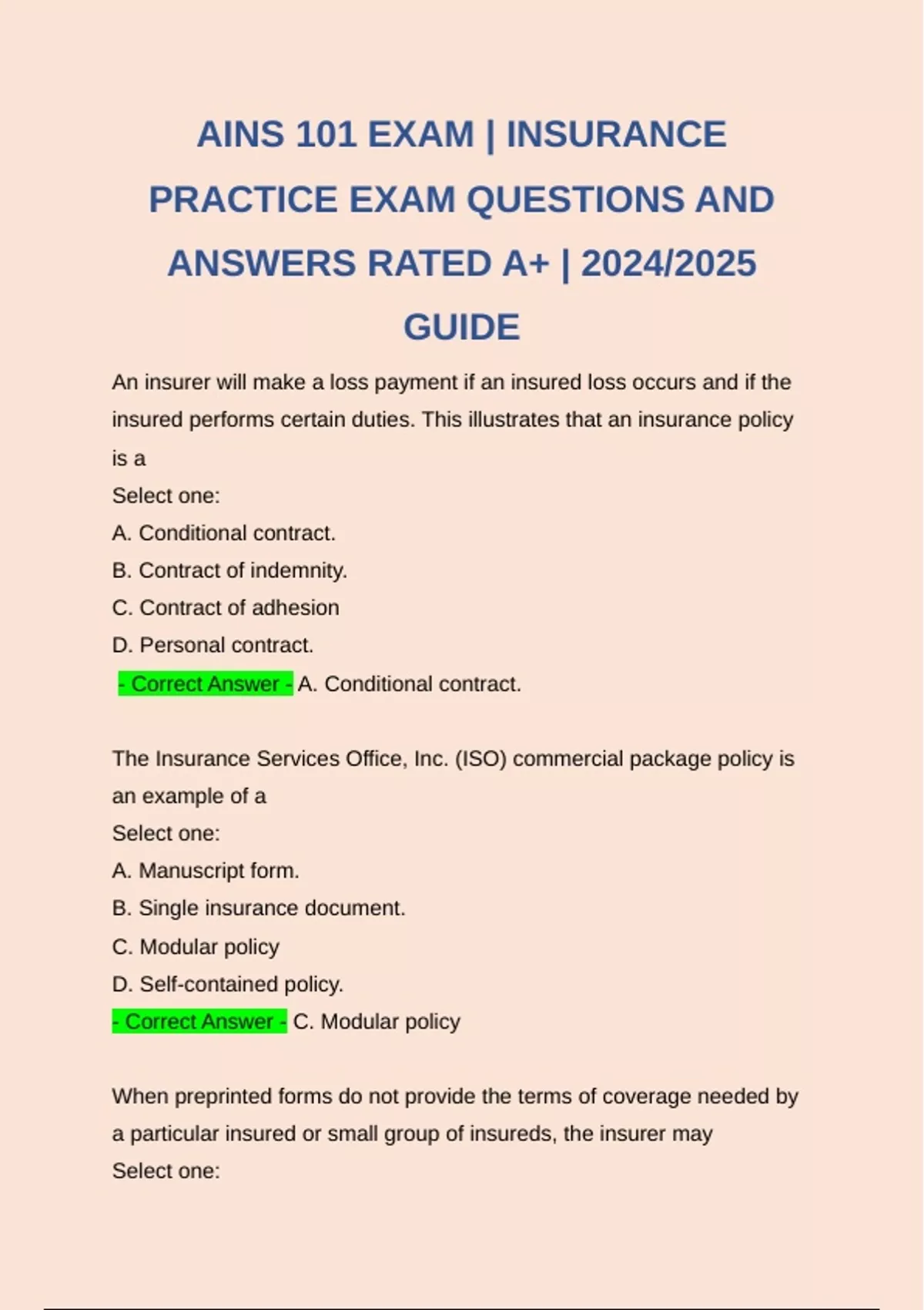 AINS 101 EXAM | INSURANCE PRACTICE EXAM QUESTIONS AND ANSWERS RATED A+ | 2024/2025 GUIDE AINS 101 EXAM | INSURANCE PRACTICE EXAM QUESTIONS AND ANSWERS RATED A+ | 2024/2025 GUIDE