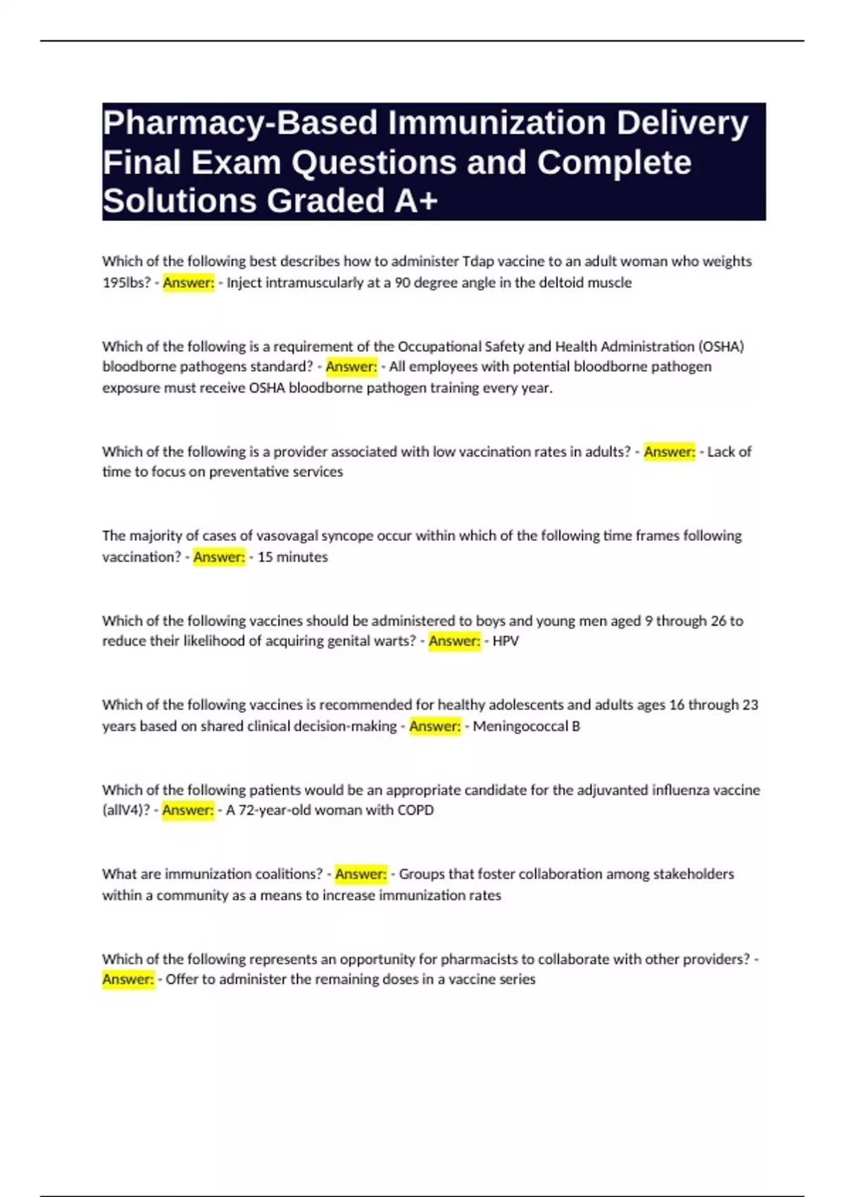 Pharmacy-Based Immunization Delivery Final Exam Questions and Complete Solutions Graded A+
