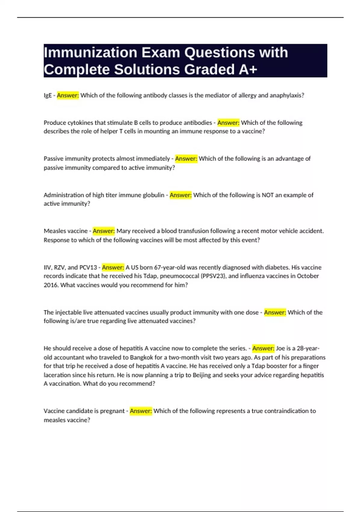 Immunization Exam Questions with Complete Solutions Graded A+