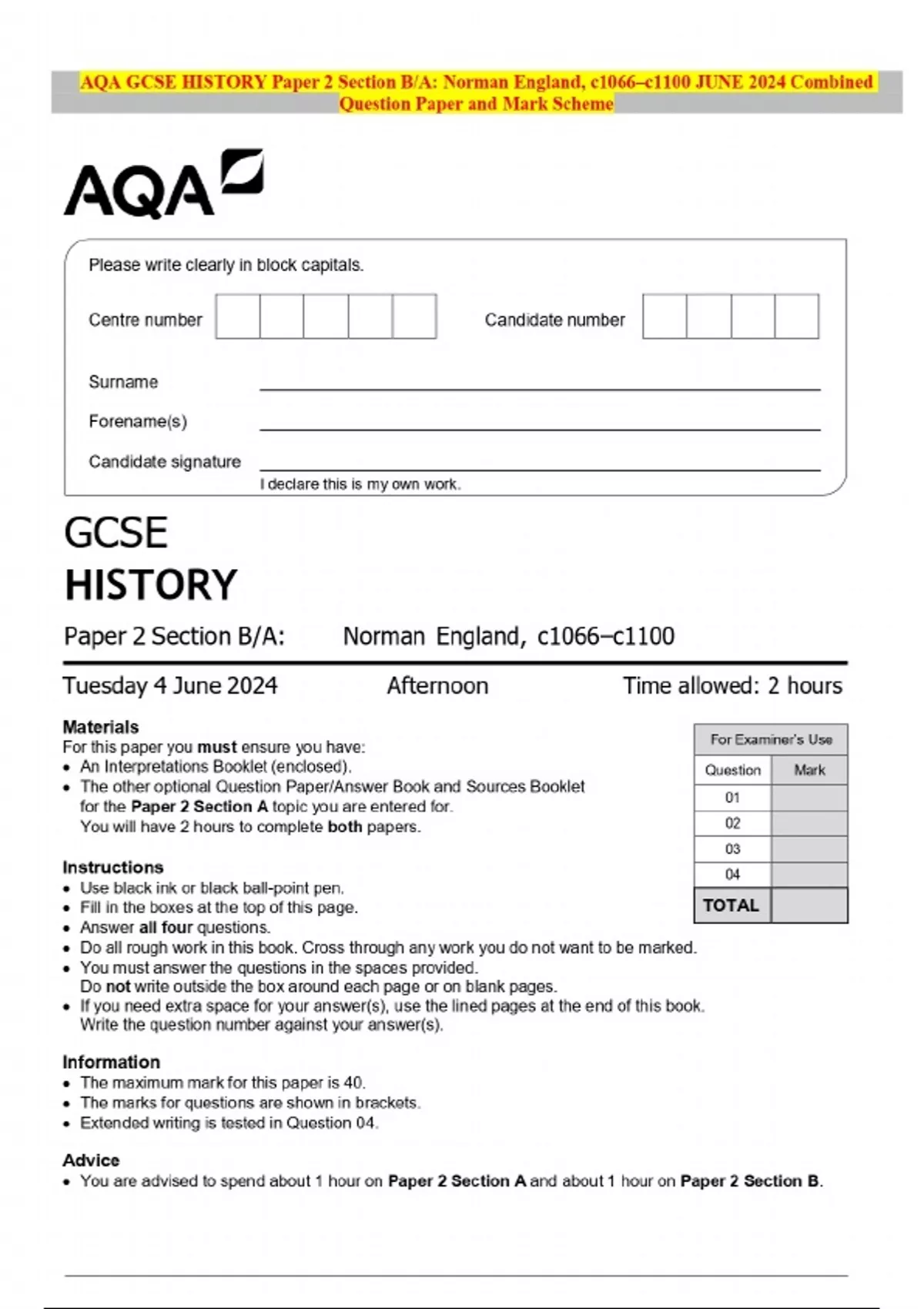 AQA GCSE HISTORY Paper 2 Section B/A: Norman England, c1066–c1100 JUNE 2024 Combined Question Paper and Mark Scheme