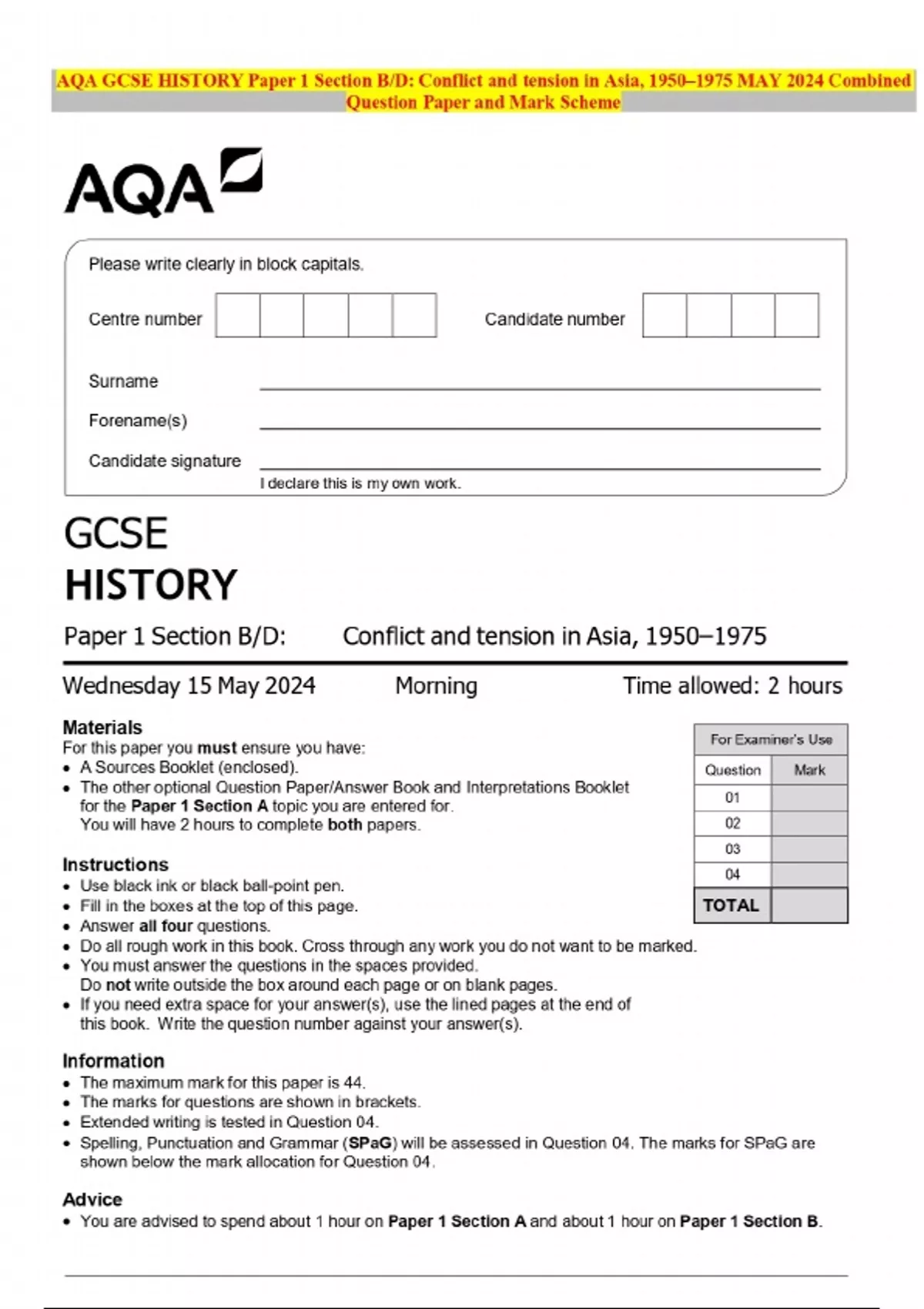 AQA GCSE HISTORY Paper 1 Section B/D: Conflict and tension in Asia, 1950–1975 MAY 2024 Combined Question Paper and Mark Scheme
