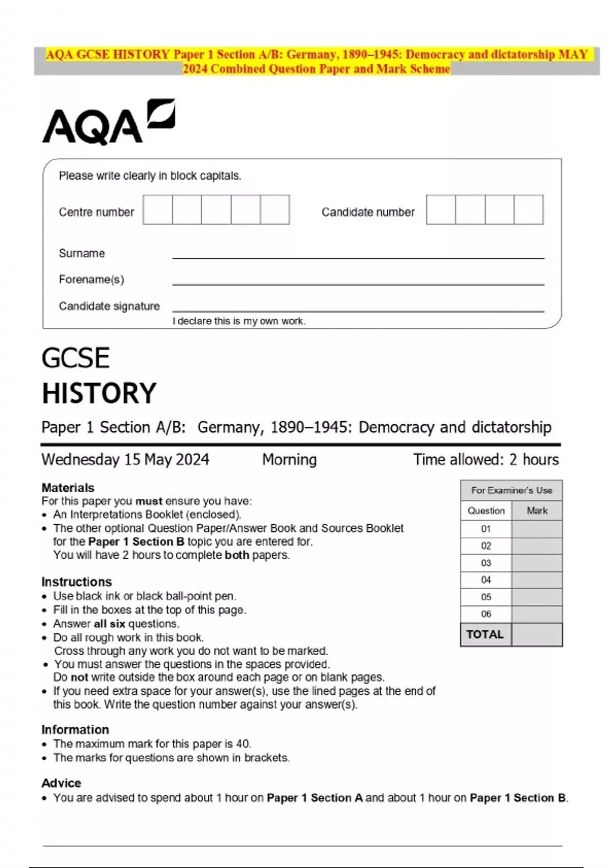 AQA GCSE HISTORY Paper 1 Section A/B: Germany, 1890–1945: Democracy and dictatorship MAY 2024 Combined Question Paper and Mark Scheme