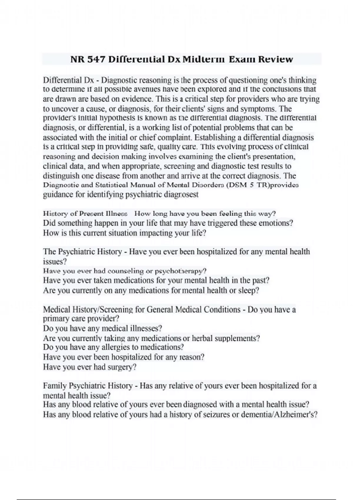 Differential Dx - Diagnostic reasoning is the process of questioning one's thinking to determine if all possible avenues have been explored and if the conclusions that are drawn are based on evidence. This is a critical step for providers who are trying to uncover a cause, or diagnosis, for their clients' signs and symptoms. The provider's initial hypothesis is known as the differential diagnosis. The differential diagnosis, or differential, is a working list of potential problems that can be associated with the initial or chief complaint. Establishing a differential diagnosis is a critical step in providing safe, quality care. This evolving process of clinical reasoning and decision making involves examining the client's presentation, clinical data, and when appropriate, screening and diagnostic test results to distinguish one disease from another and arrive at the correct diagnosis. The Diagnostic and Statistical Manual of Mental Disorders (DSM-5-TR)provides guidance for identifying psychiatric diagnosest History of Present Illness - How long have you been feeling this way? Did something happen in your life that may have triggered these emotions? How is this current situation impacting your life? The Psychiatric History - Have you ever been hospitalized for any mental health issues? Have you ever had counseling or psychotherapy? Have you ever taken medications for your mental health in the past? Are you currently on any medications for mental health or sleep? Medical History/Screening for General Medical Conditions - Do you have a primary care provider? Do you have any medical illnesses? Are you currently taking any medications or herbal supplements? Do you have any allergies to medications? Have you ever been hospitalized for any reason? Have you ever had surgery? Family Psychiatric History - Has any relative of yours ever been hospitalized for a mental health issue? Has any blood relative of yours ever been diagnosed with a mental health issue? Has any blood relative of yours had a history of seizures or dementia/Alzheimer's? Social and Developmental History - Tell me a little bit about your childhood and how you grew up. How was your experience in school when you were younger? Did you enjoy school? How do you support yourself with your finances? Do you have a good support system? Are you currently in a relationship? Where do you live? Who do you live with? What do you do in your free time? What activities do you enjoy? Which of the following should be included when providing client education about medication regimens? Select all that apply. - A)Explain how the medication targets the symptoms, specific benefits, and expected time course. (Correct answer) B)Identify potential side effects, duration of side effects, and adverse effects. (Correct answer) C)Explain the instructions, dosing, and special requirements. (Correct answer) D)Use teach-back methods to ensure client understanding. (Correct answer) Apply the Ask Suicide-Screening Questions (ASQ) Suicide Risk Screening Tool (Links to an external site.) to the scenario below. A 52-year-old client presents to the emergency department following a car accident. The emergency department (ED) physician is concerned that the client may have intentionally crashed her car and requests a stat PMHNP consult. In speaking with the PMHNP, the client describes persistent feelings of sadness and hopelessness. She states that she often wonders if her husband would be happier if she wasn't around anymore since she's never happy and sometimes thinks about what it would be like to just take a handful of sleeping pills and go to sleep forever. The client reports a previous suicide attempt when she was 16 but denies that she is considering killing herself right now. Based on the client's ASQ score, what is the most appropriate response? A) No action is necessary as the client is not currently considering suicide. B)Provide a brief suicide safety assessment. C)Alert the client's primary care physician. D)Provide a STAT safety and full mental health evaluation. - B)Provide a brief suicide safety assessment. Rationale: While the client's responses do not indicate a need for a stat full safety and mental health evaluation, the client requires a brief suicide safety assessment to determine whether a full mental health evaluation in necessary. It is also important to notify the client's physician or the clinician responsible for the client's care. Complete Blood Count - The CBC is a serum diagnostic test that measures red blood cells, white blood cells, hemoglobin, hematocrit, and platelets. The CBC includes a differential of the white blood cells. A CBC is often included as part of routine health screening or to obtain information related to specific conditions. In mental health, the CBC is used to rule out medical conditions that may present with symptoms that can be attributed to both medical and psychiatric diagnoses. For example, the CBC can help rule out anemia as a cause for depressive symptoms and fatigue or rule out infection as a cause of acute mental status changes. The CBC is also used to monitor certain treatment regimens. For example, some medications, such as clozapine, require routine analysis of absolute neutrophil count and platelet levels. Normal Range of: Red blood cells Hemoglobin Hematocrit Reticulocytes - Red blood cells: 4.5-6.0 million/microliter Hemoglobin: 12-18 grams/100 mL Hematocrit: 38%-48% Reticulocytes: 0%-1.5% Normal Range of? White blood cells (total): Neutrophils: Eosinophils: Basophils: Lymphocytes: Monocytes: Platelets: - White blood cells (total): 5000-10,000/microliter Neutrophils: 55%-70% Eosinophils: 1%-3% Basophils: 0.5%-1% Lymphocytes: 20%-35% Monocytes: 3%-8% Platelets: 150,000-300,000/microliter Comprehensive Metabolic Panel (CMP) - The CMP is another common blood test used to determine general health status. The CMP includes several tests that provide information about fluid and electrolyte balance as well as the