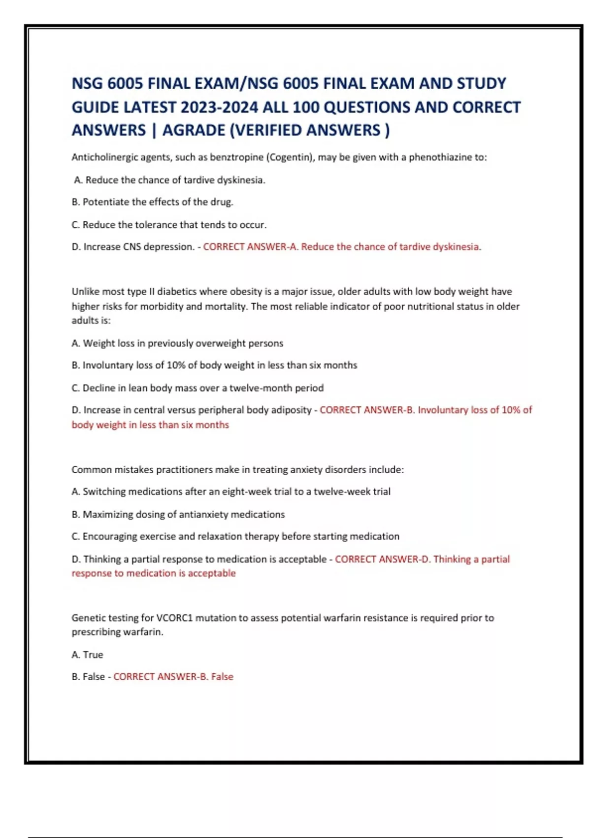 NSG 6005 FINAL EXAM/NSG 6005 FINAL EXAM AND STUDY GUIDE LATEST ALL 100 QUESTIONS AND CORRECT ANSWERS | AGRADE (VERIFIED ANSWERS ) NSG 6005 FINAL EXAM/NSG 6005 FINAL EXAM AND STUDY GUIDE LATEST ALL 100 QUESTIONS AND CORRECT ANSWERS | AGRADE (VERIFIED ANSWERS )