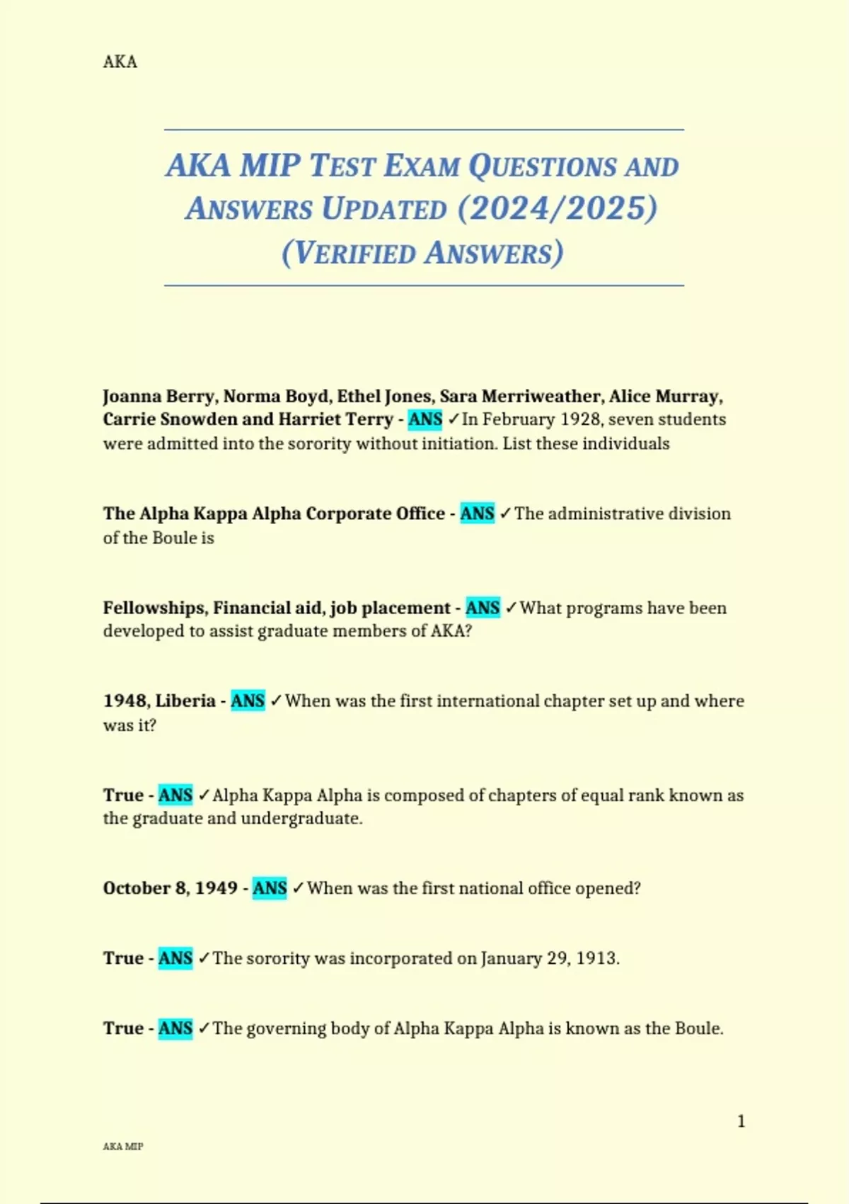 This document provides the updated 2024/2025 AKA MIP test questions along with fully verified correct answers. It reviews the key concepts, organizational knowledge, history, and procedural information typically assessed during the Membership Intake Process. The material is structured for clear studying and supports thorough preparation aligned with current testing expectations.