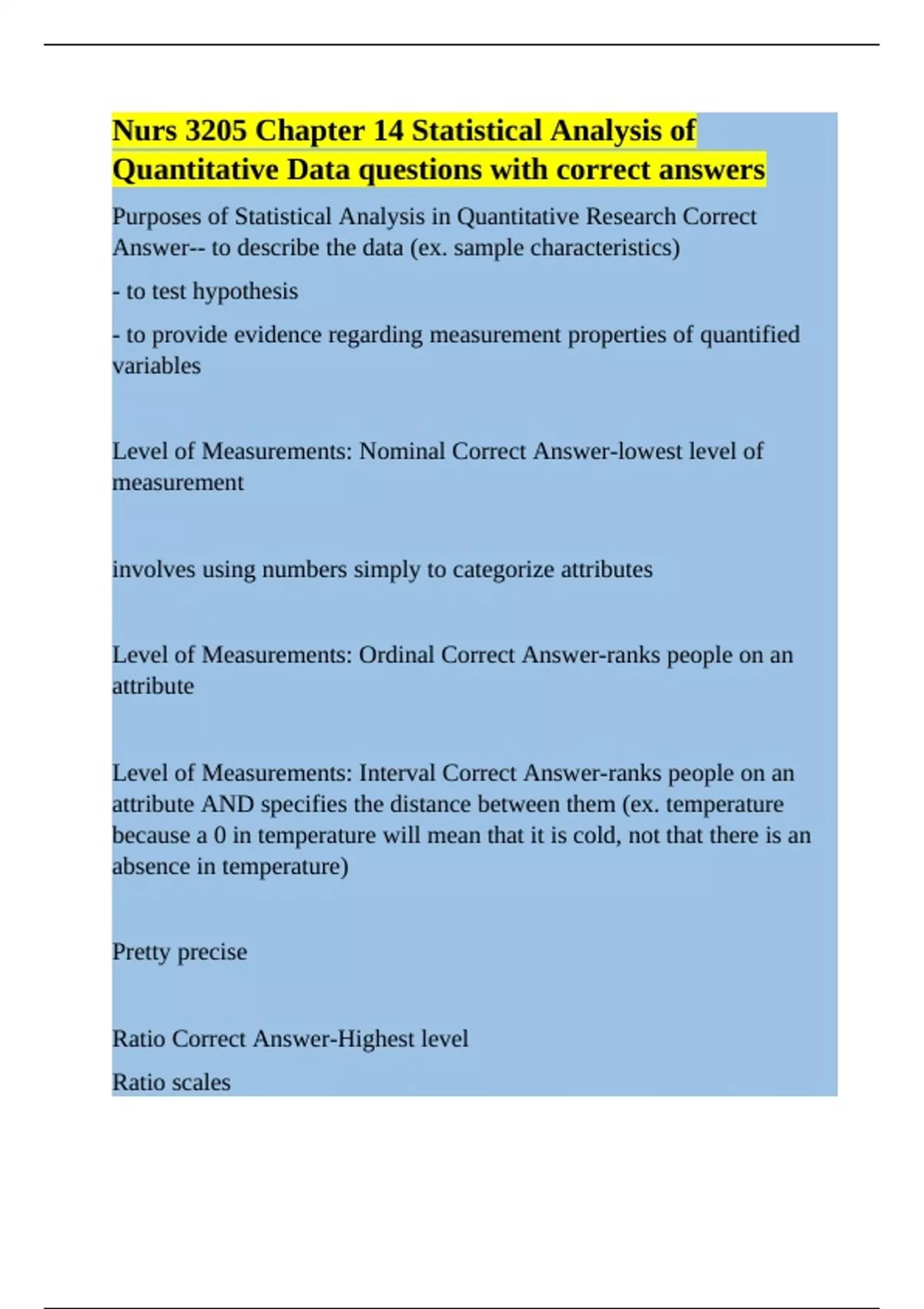 Nurs 3205 Chapter 14 Statistical Analysis of Quantitative Data questions with correct answers.