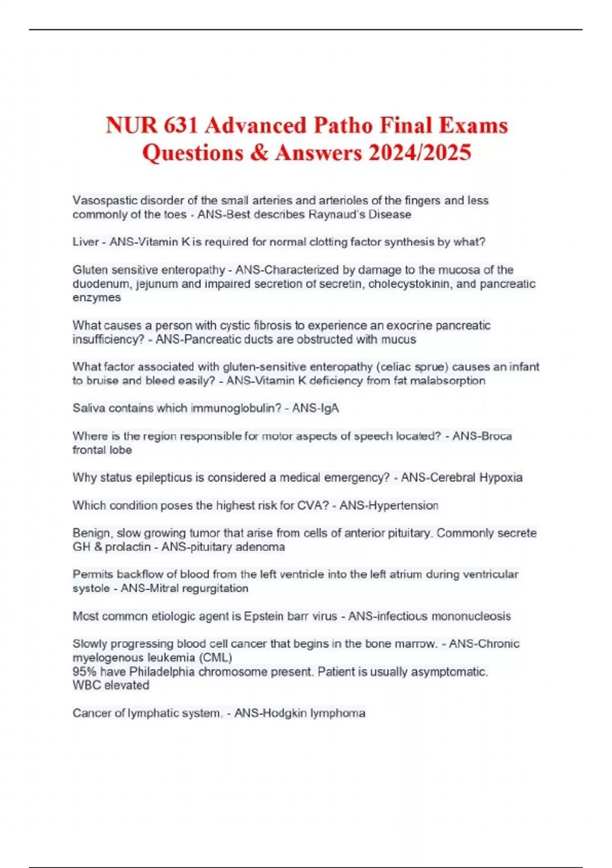 NUR 631 Advanced Patho Final Exams Questions & Answers 2024/2025 Vasospastic disorder of the small arteries and arterioles of the fingers and less commonly of the toes - ANS-Best describes Raynaud’s Disease Liver - ANS-Vitamin K is required for normal clotting factor synthesis by what? Gluten sensitive enteropathy - ANS-Characterized by damage to the mucosa of the duodenum, jejunum and impaired secretion of secretin, cholecystokinin, and pancreatic enzymes What causes a person with cystic fibrosis to experience an exocrine pancreatic insufficiency? - ANS-Pancreatic ducts are obstructed with mucus What factor associated with gluten-sensitive enteropathy (celiac sprue) causes an infant to bruise and bleed easily? - ANS-Vitamin K deficiency from fat malabsorption Saliva contains which immunoglobulin? - ANS-IgA Where is the region responsible for motor aspects of speech located? - ANS-Broca frontal lobe Why status epilepticus is considered a medical emergency? - ANS-Cerebral Hypoxia Which condition poses the highest risk for CVA? - ANS-Hypertension Benign, slow growing tumor that arise from cells of anterior pituitary. Commonly secrete GH & prolactin - ANS-pituitary adenoma Permits backflow of blood from the left ventricle into the left atrium during ventricular systole - ANS-Mitral regurgitation Most common etiologic agent is Epstein barr virus - ANS-infectious mononucleosis Slowly progressing blood cell cancer that begins in the bone marrow. - ANS-Chronic myelogenous leukemia (CML) 95% have Philadelphia chromosome present. Patient is usually asymptomatic. WBC elevated Cancer of lymphatic system. - ANS-Hodgkin lymphoma May produce free immunoglobulin light chain (Bence Jones protein) that is present in the blood and urine of 80% of patients Treatment for polycythemia - ANS-Phlebotomy How does the body compensate for anemia? - ANS-Kidneys release more erythropoietin What type of anemia is characterized by fatigue, weakness, dyspnea, brittle concave nails, and conjunctive of eyes - ANS-Iron Deficiency The underlying disorder of which anemia is a result of the defective secretion of the intrinsic factor which is essential for the absorption of vitamin B12 - ANS-Pernicious which is also classified as a megaloblastic anemia Deficiencies in folate and vitamin B12 alter the synthesis of what? - ANS-DNA PFT- pulmonary function test - ANS-The critical criteria for diagnosis of lung function. involves looking at the FEV1/FVC ratio as it will be less than 0.70 Aplastic anemia and pancytopenia develop as a result of? - ANS-Suppression of the bone marrow to produce adequate amounts of erythrocytes, leukocytes, and thrombocytes Unregulated release of thrombin with subsequent fibrin formation and accelerated fibrinolysis - ANS-Disseminated intravascular coagulation (DIC Example of compensatory hyperplasia - ANS-Liver Regeneration What causes the rapid change in the resting membrane potential to initiate action potential - ANS-Sodium gates open, sodium rises into the cell which changes the membrane potential from negative to positive What type of necrosis is often associated with pulmonary tuberculosis? - ANS-Caseous Necrosis Low plasma albumin causes edema as a result of a reduction in which pressure - ANS-plasma oncotic When a child inherits a disease that is autosomal recessive, who is it inherited from? - ANS-Both parents are carriers What mechanism can cause hypernatremia? - ANS-Loss of H2O DM Insufficient H2O intake hypertonic solution over secretion of aldosterone Cushing Disease Prader-Willi Syndrome - ANS-Inherited from father Constant sense of hunger after age of 2 Obesity behavior problems mental retardation short structure Mechanism that causes Hyperkalemia - ANS-Potassium sparing diuretic hypoaldosteronism shift from ICF to ECF Metabolic Acidosis Likely cause of Respiratory Acidosis - ANS-Over sedation Brain stem trauma PE, COPD alveolar hypoventilation disorder of lung parenchyma depression of respiratory center When considering WBC differentials acute inflammatory reasons are related to elevations of what leukocyte? - ANS-Neutrophils Osteosarcoma - ANS-Most common type of cancer that starts in the bone The common hay fever allergy is expressed through a reaction that is mediated by which class of immunoglobulins? - ANS-IgE Cytokines are thought to cause fevers by stimulating the synthesis of which chemical mediators? - ANS-Prostaglandin/ endogenous pyrogens (213) Which cells are primary target for HIV - ANS-Neural cells CD4 macrophages NK cells The mammary gland enlarges during pregnancy primarily as a consequence of what type of hormonal event? - ANS-Hormonal Hyperplasia Perceived stress elicits an emotional anticipatory response that begins where? - ANS-Limbic System Paraventricular nucleus of the hypothalamus The most common site for a patient diagnosed with prostate cancer is which location? - ANS-Bone (spine) liver adrenal gland lymph nodes lung Where is the neurotransmitter norepinephrine secreted? - ANS-Sympathetic post ganglion Thyroid Stimulating Hormone (TSH) is released to stimulate the thyroid hormone and is inhibited when plasma levels are adequate. An example would be? - ANS-Negative Feedback The common hay fever allergy is expressed through a reaction that is mediated by what class of immunoglobulins? - ANS-IgE Aldosterone directly increases the reabsorption of what? - ANS-Sodium and water What is the action of calcitonin? - ANS-TX of osteoporosis, osteoarthritis, metastatic cancer Paget bone disease Stops calcium production or reduce the concentration of calcium in the blood inhibits bone reabsorbing osteoclasts Which lab value would the APRN expect to find if a person is experiencing syndrome inappropriate anti diuretic hormone (SIADH) - ANS-ADH is low hyponatremia hypoosmolality Crave fluids Somogyi Effect - ANS-hypoglycemia is followed by hyperglycemia A person has acne, truncal obesity, thin extremities, and bruises easily. What is the endocrine diagnosis? - ANS-Cushing