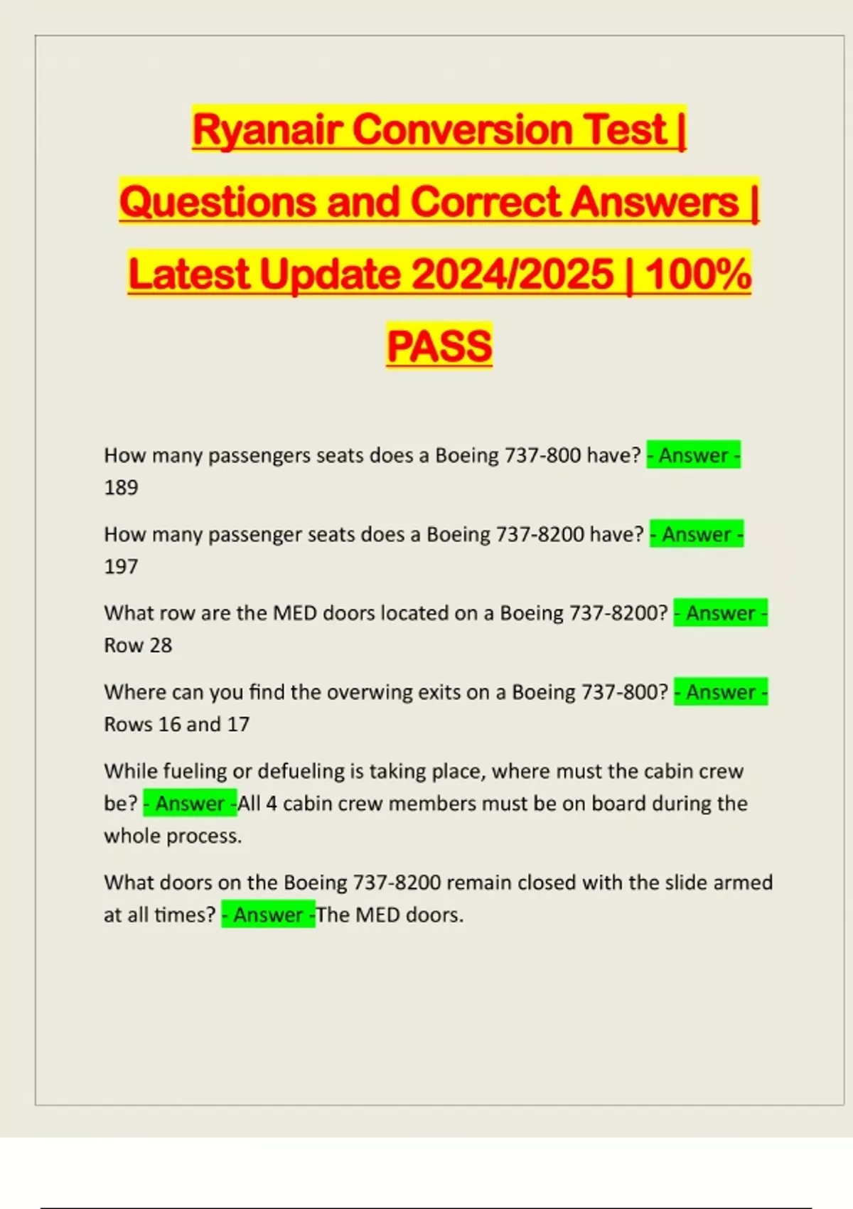 Ryanair Conversion Test | Questions and Correct Answers | Latest Update 2024/2025 | 100% PASS How many passengers seats does a Boeing 737-800 have? - Answer - 189 How many passenger seats does a Boeing 737-8200 have? - Answer - 197 What row are the MED doors located on a Boeing 737-8200? - Answer - Row 28 Where can you find the overwing exits on a Boeing 737-800? - Answer - Rows 16 and 17 While fueling or defueling is taking place, where must the cabin crew be? - Answer -All 4 cabin crew members must be on board during the whole process. What doors on the Boeing 737-8200 remain closed with the slide armed at all times? - Answer -The MED doors.Number 4 shall proceed to the boarding gate if there are ____ ____ ___ __________ on the aircraft once fuelling has finished. - Answer -less than 150 passengers Can anyone use the toilets onboard the aircraft while fueling or defueling is taking place? - Answer -NO! Toilets must be locked while fueling/defueling. What are the PDI's on the FREON? - Answer -1. Two nozzles direct towards waste bin