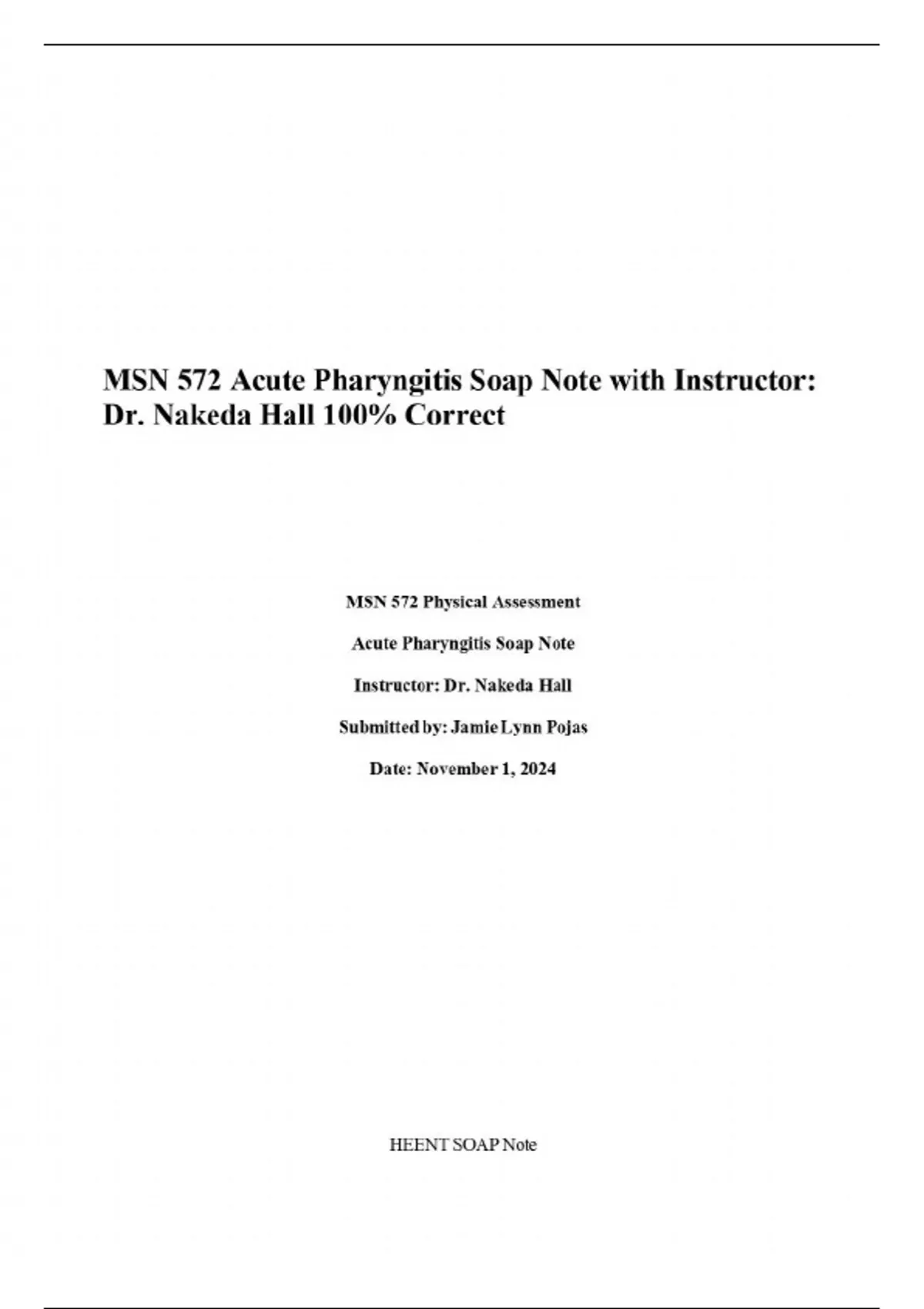 MSN 572 Acute Pharyngitis Soap Note with Instructor: Dr. Nakeda Hall 100% Correct