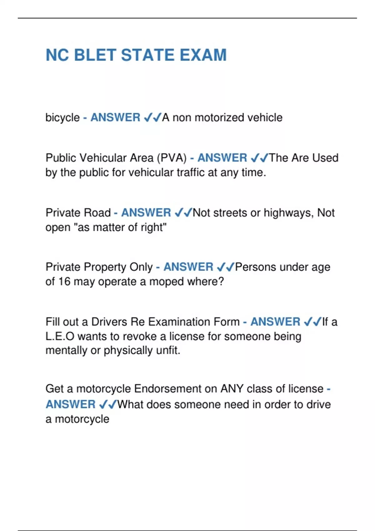 NC BLET STATE EXM bicycle - ANSWER ✔✔A non motor