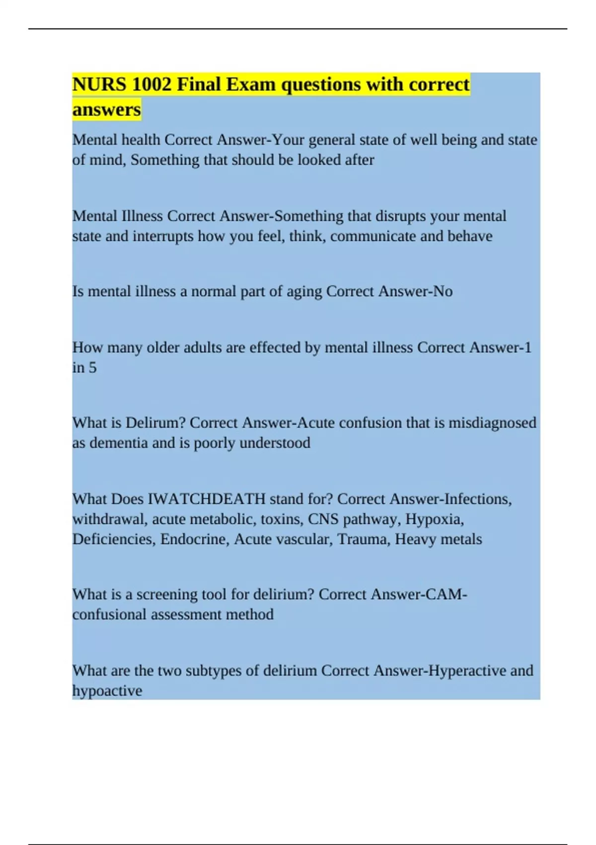 Mental health Correct Answer-Your general state of well being and state