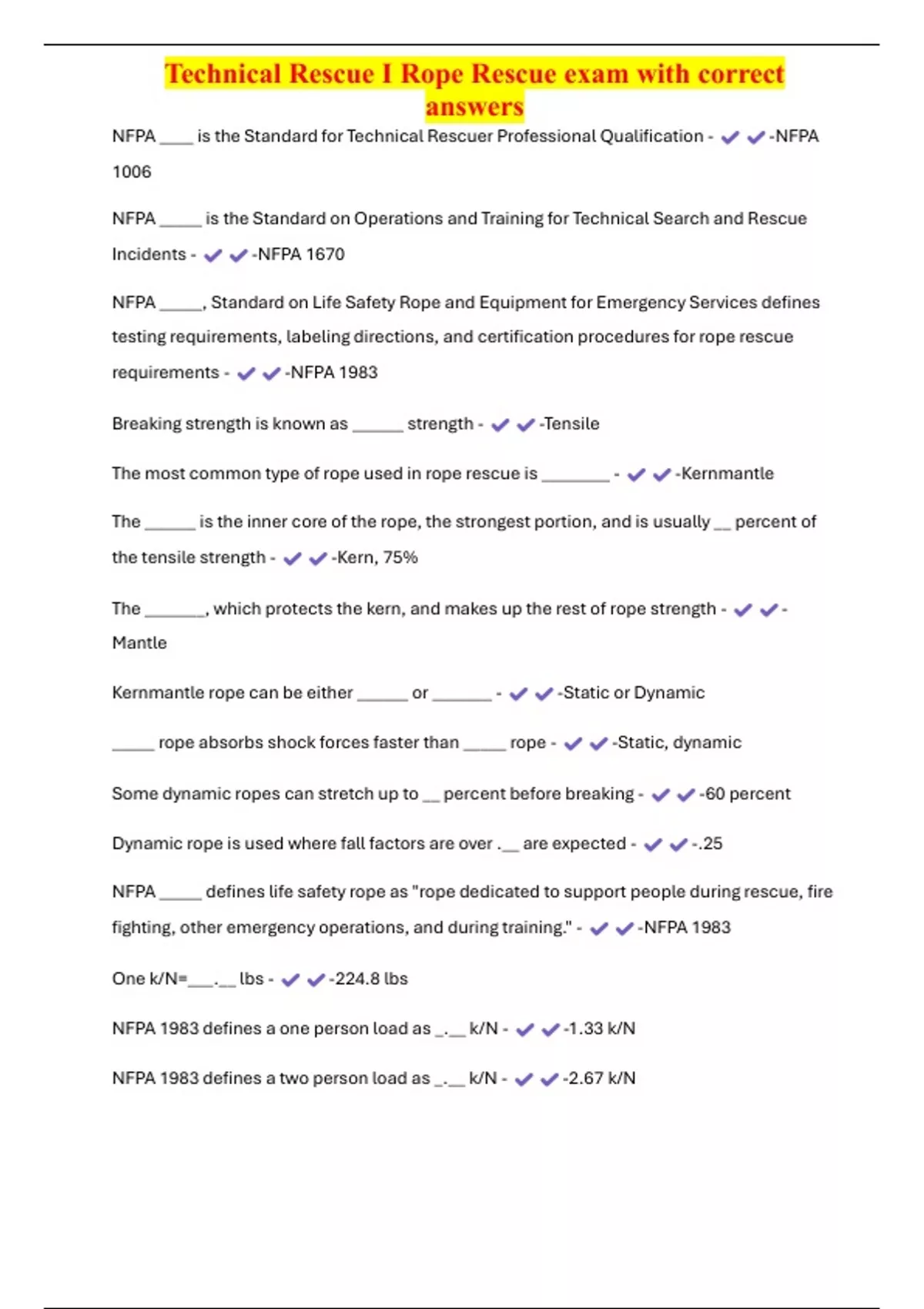, Technical Rescue I Rope Rescue exam with correct