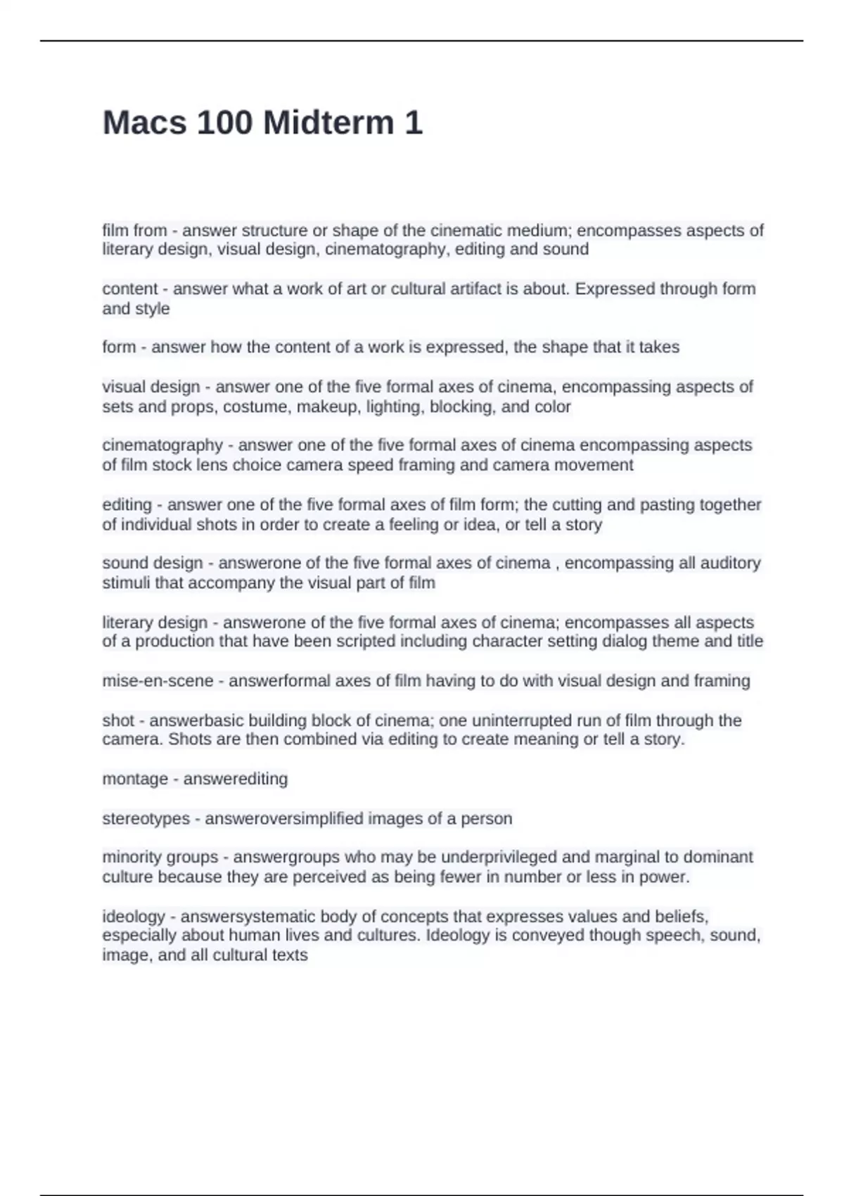 editing - answer one of the five formal axes of film form; the cutting and pasting together