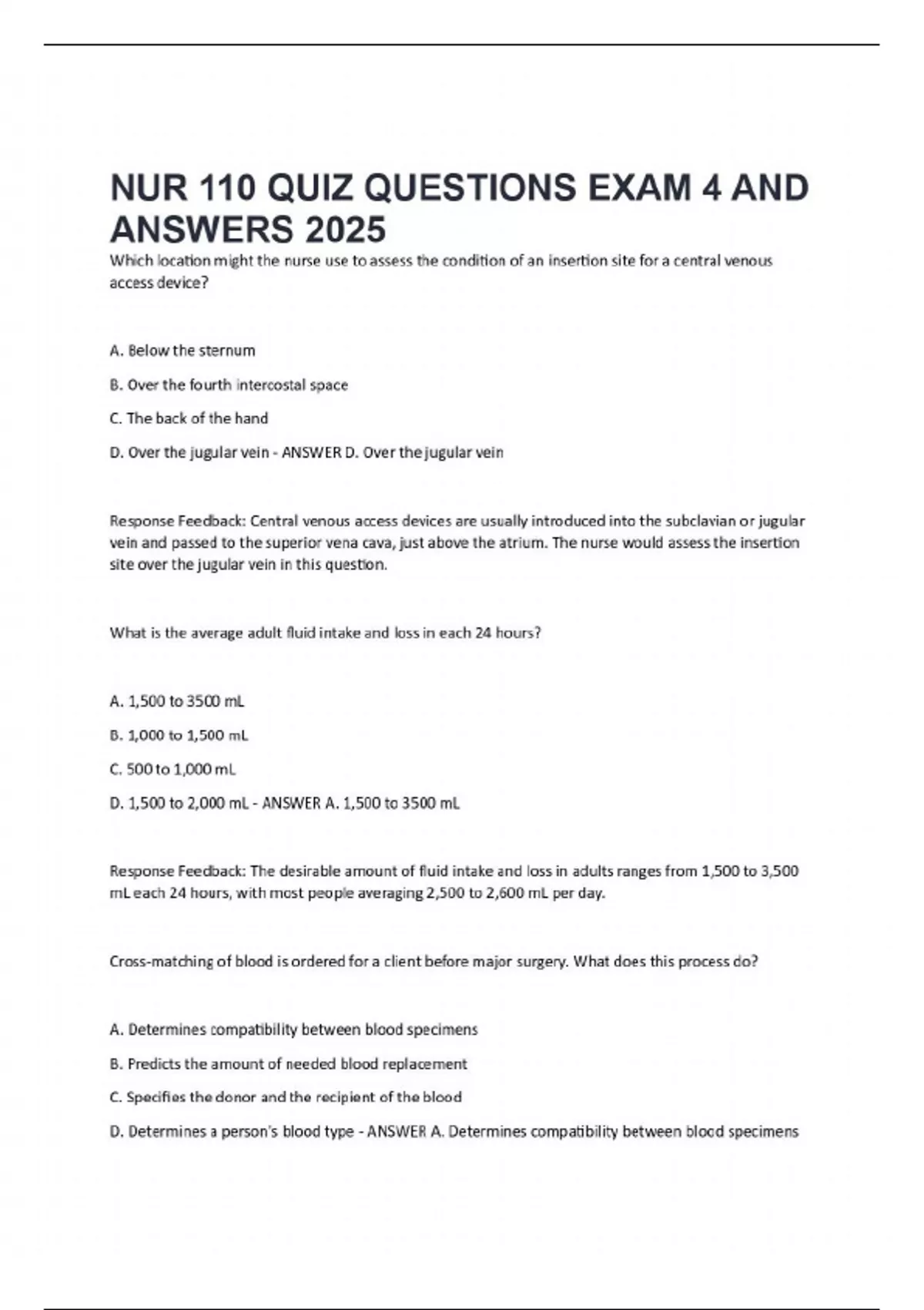 Which location might the nurse use to assess the condition of an insertion site for a central venous access device? A. Below the sternum B. Over the fourth intercostal space C. The back of the hand D. Over the jugular vein - ANSWER D. Over the jugular vein Response Feedback: Central venous access devices are usually introduced into the subclavian or jugular vein and passed to the superior vena cava, just above the atrium. The nurse would assess the insertion site over the jugular vein in this question. What is the average adult fluid intake and loss in each 24 hours? A. 1,500 to 3500 mL B. 1,000 to 1,500 mL C. 500 to 1,000 mL D. 1,500 to 2,000 mL - ANSWER A. 1,500 to 3500 mL Response Feedback: The desirable amount of fluid intake and loss in adults ranges from 1,500 to 3,500 mL each 24 hours, with most people averaging 2,500 to 2,600 mL per day. Cross-matching of blood is ordered for a client before major surgery. What does this process do? A. Determines compatibility between blood specimens B. Predicts the amount of needed blood replacement C. Specifies the donor and the recipient of the blood D. Determines a person's blood type - ANSWER A. Determines compatibility between blood specimens Response Feedback: Before any blood can be given to a client, it must be determined that the blood of the donor is compatible with that of the client. The process of determining compatibility between blood spe
