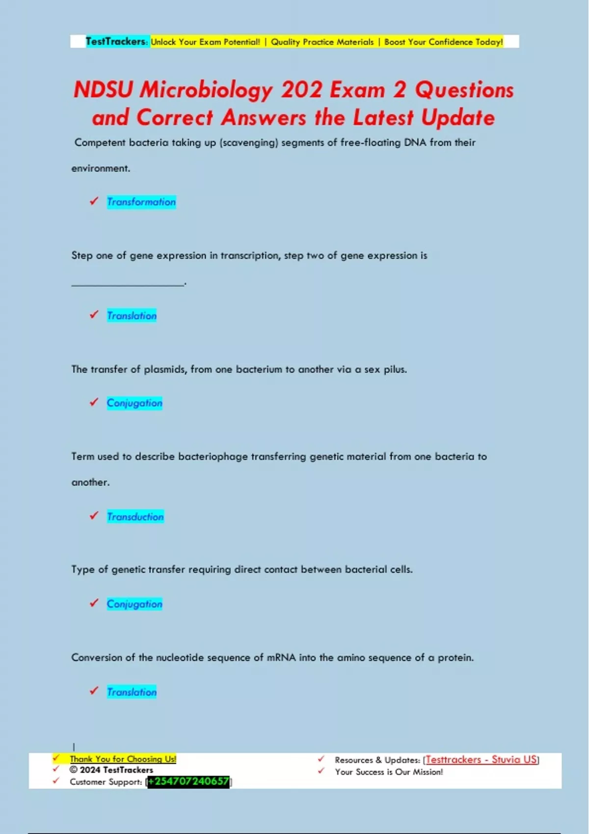 Competent bacteria taking up (scavenging) segments of free-floating DNA from their environment. Transformation Step one of gene expression in transcription, step two of gene expression is ___________________. Translation The transfer of plasmids, from one bacterium to another via a sex pilus. Conjugation Term used to describe bacteriophage transferring genetic material from one bacteria to another. Transduction Type of genetic transfer requiring direct contact between bacterial cells. Conjugation Conversion of the nucleotide sequence of mRNA into the amino sequence of a protein. Translation TestTrackers: Unlock Your Exam Potential! | Quality Practice Materials | Boost Your Confidence Today! | Thank You for Choosing Us! © 2024 TestTrackers Customer Support: [] Resources & Updates: [Testtrackers - Stuvia US] Your Success is Our Mission! Synthesis of a mRNA coppy of DNA is called ________________. Transcription A general term used to describe any of the several methods bacteria use to transfer genetic info laterally, to members of the same generation. Horizontal Transfer Specialized type of genetic transfer in which transposons are passed from one bacteria to another. Transposition Genes for capsule production can be transferred from dead, encapsulated S. pneumoniae to live unencapsulated S. pneumoniae. This type of genetic transfer is referred to as ___________________. Transformation General term describing an antimicrobial agent that kills bacteria. Bacteriocidal Macromolecule composed of repeating units called nucleotides. DNA TestTrackers: Unlock Your Exam Potential! | Quality Practice Materials | Boost Your Confidence Today! | Thank You for Choosing Us! © 2024 TestTrackers Customer Support: [] Resources & Updates: [Testtrackers - Stuvia US] Your Success is Our Mission! Heat treatment used in the canning industry designed to destroy C. botulinum endospores (but does not necessariily result in sterilization). Commercial Sterilization Highly resistant forms which some microbes produce to withstand unfavorable environmental conditions. Endospores Segments of DNA which encode proteins. Genes Physical method of controll