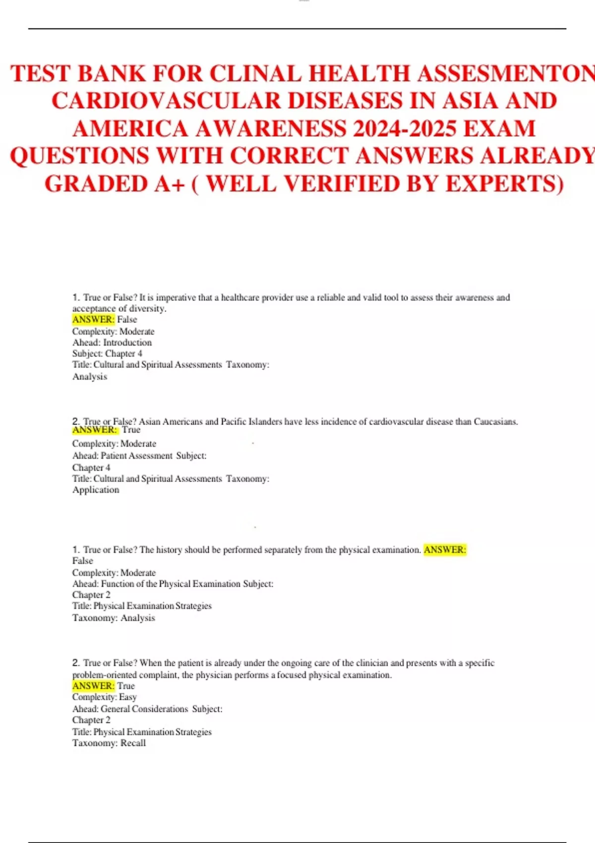TEST BANK FOR CLINAL HEALTH ASSESMENTON