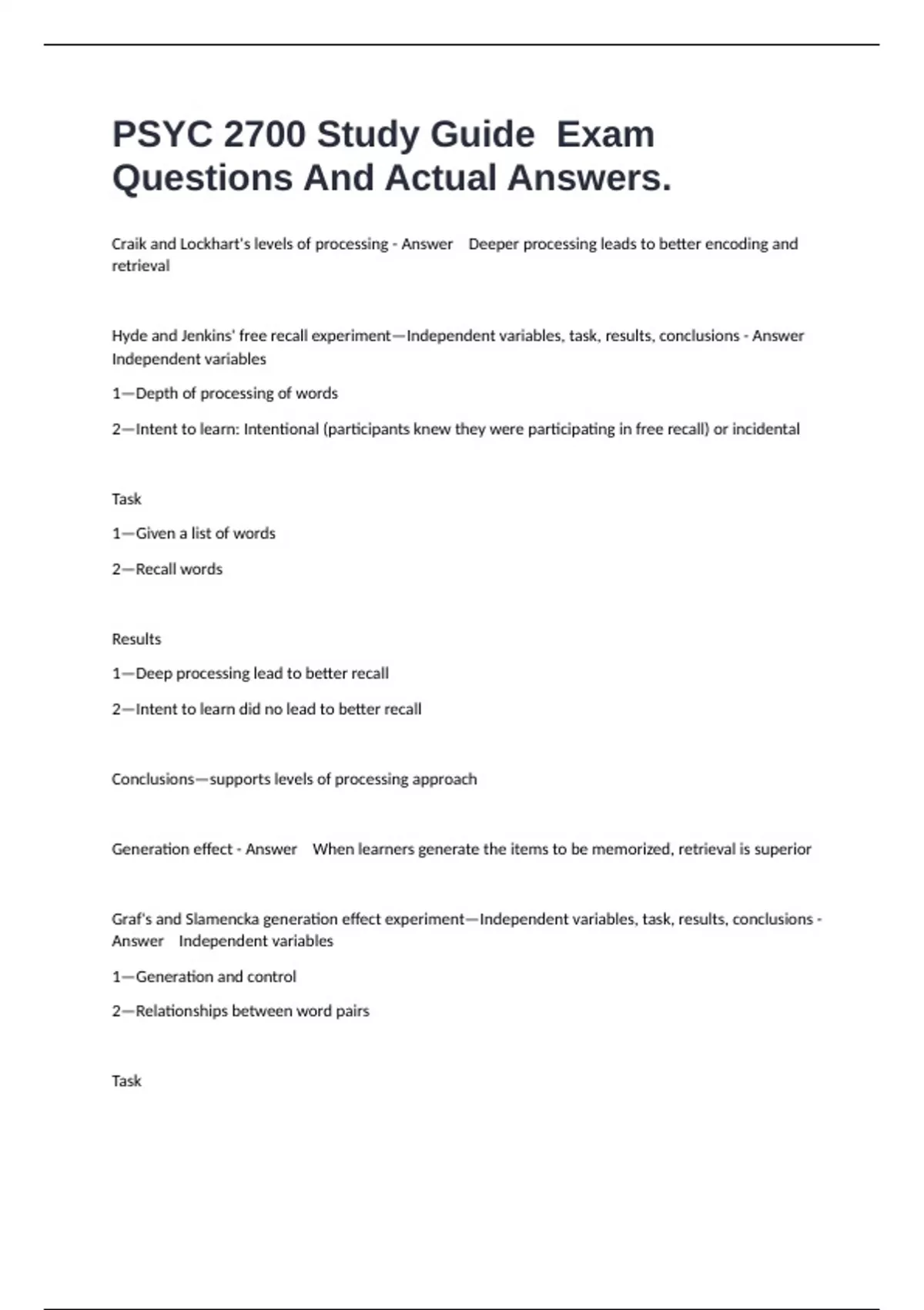 Hyde and Jenkins' free recall experiment—Independent variables, task, results, conclusions - Answer