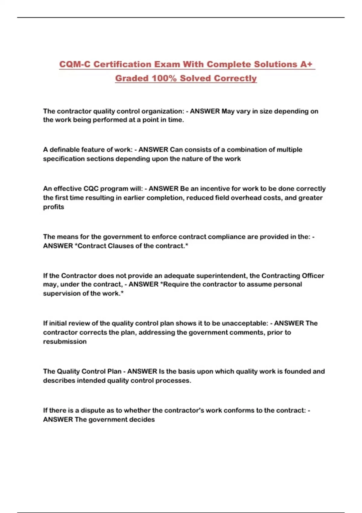 CQM-C Certification Exam With Complete Solutions A+