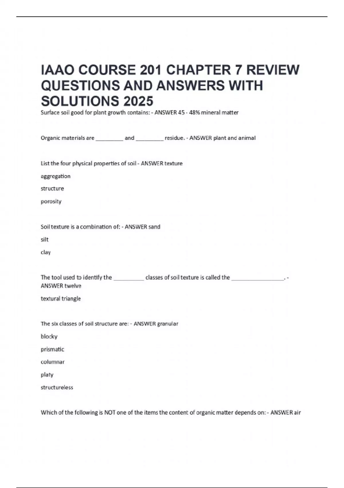 Surface soil good for plant growth contains: - ANSWER 45 - 48% mineral matter Organic materials are _________ and _________ residue. - ANSWER plant and animal List the four physical properties of soil - ANSWER texture aggregation structure porosity Soil texture is a combination of: - ANSWER sand silt clay The tool used to identify the __________ classes of soil texture is called the _________________. - ANSWER twelve textural triangle The six classes of soil structure are: - ANSWER granular blocky prismatic columnar platy structureless Whi