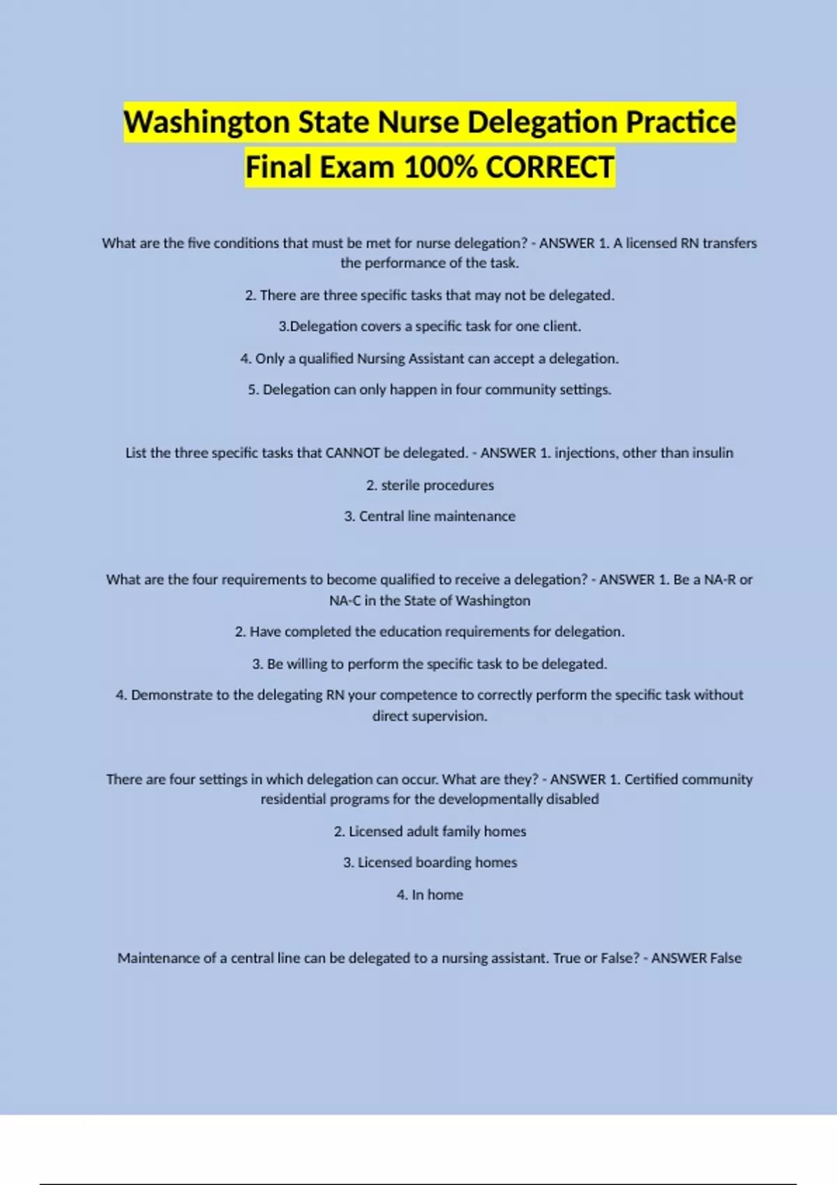 What are the five conditions that must be met for nurse delegation? - ANSWER 1. A licensed RN transfers