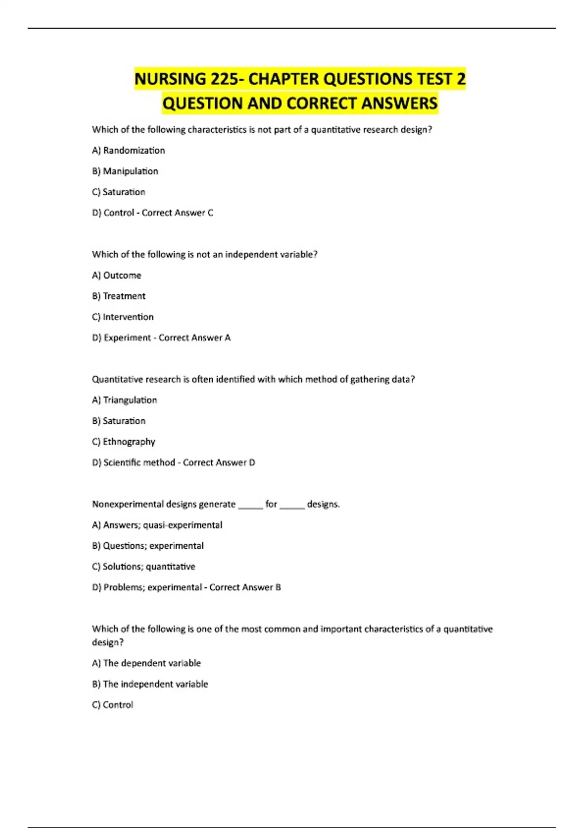 NURSING 225- CHAPTER QUESTIONS TEST 2 QUESTION AND CORRECT ANSWERS Which of the following characteristics is not part of a quantitative research design? A) Randomization B) Manipulation C) Saturation D) Control - Correct Answer C Which of the following is not an independent variable? A) Outcome B) Treatment C) Intervention D) Experiment - Correct Answer A Quantitative research is often identified with which method of gathering data? A) Triangulation B) Saturation C) Ethnography D) Scientific method - Correct Answer D Nonexperimental designs generate _____ for _____ designs. A) Answers; quasi-experimental B) Questions; experimental C) Solutions; quantitative D) Problems; experimental - Correct Answer B Which of the following is one of the most common and important characteristics of a quantitative design? A) The dependent variable B) The independent variable C) Control