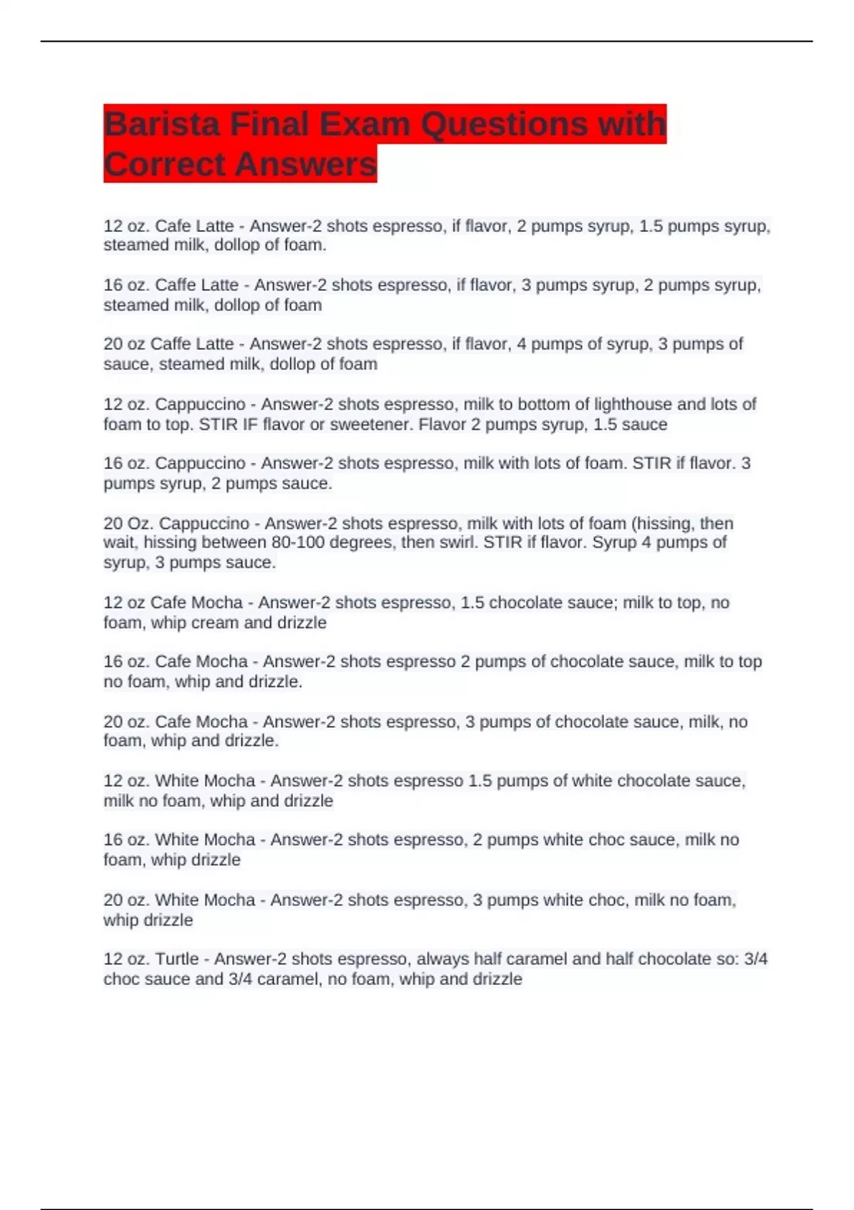 Barista Final Exam Questions with