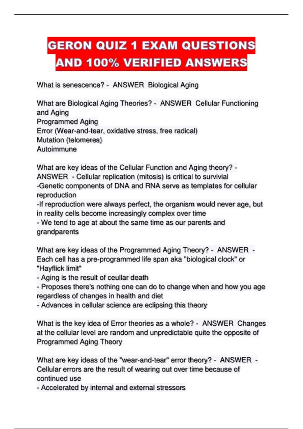 What are Biological Aging Theories? - ANSWER Cellular Functioning