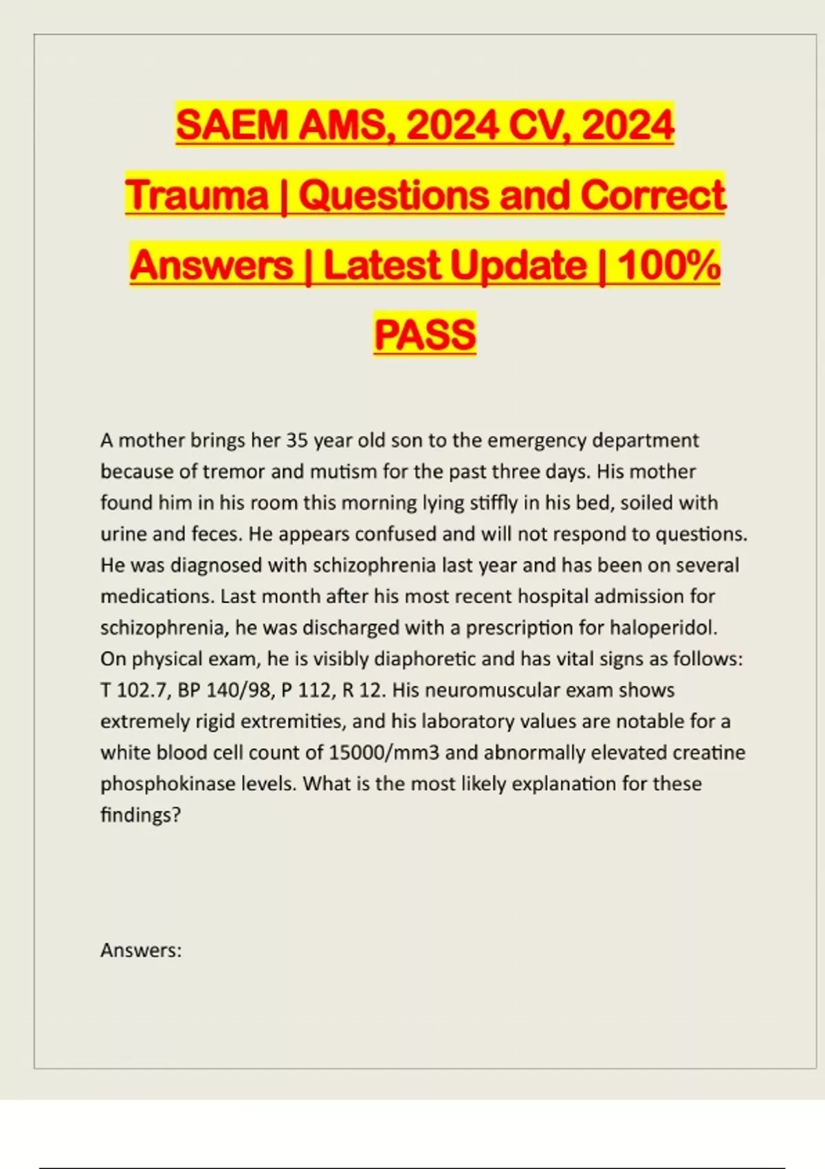 SAEM AMS, 2024 CV, 2024 Trauma | Questions and Correct Answers | Latest Update | 100% PASS A mother brings her 35 year old son to the emergency department because of tremor and mutism for the past three days. His mother found him in his room this morning lying stiffly in his bed, soiled with urine and feces. He appears confused and will not respond to questions. He was diagnosed with schizophrenia last year and has been on several medications. Last month after his most recent hospital admission for schizophrenia, he was discharged with a prescription for haloperidol. On physical exam, he is visibly diaphoretic and has vital signs as follows: T 102.7, BP 140/98, P 112, R 12. His neuromuscular exam shows extremely rigid extremities, and his laboratory values are notable for a white blood cell count of 15000/mm3 and abnormally elevated creatine phosphokinase levels. What is the most likely explanation for these findings? Answers:leptic-induced acute dystonia leptic malignant syndrome - Answer -NMS A 25 year old man returns to the ED, 24 hours after being released from the hospital with a new diagnosis of schizophrenia. He has recently started to take haloperidal for his psychotic symptoms. In the ED he is noted to have involuntary contractions of the muscles of the face, a protruding tongue, deviation of the head to one side, and sustained upward deviation of the eyes. Vital signs are stable, and initial labs show no electrolyte or hematological abnormalities. Of the following choices, the preferred medication for this condition is: Answers: nhydramine epam barbital